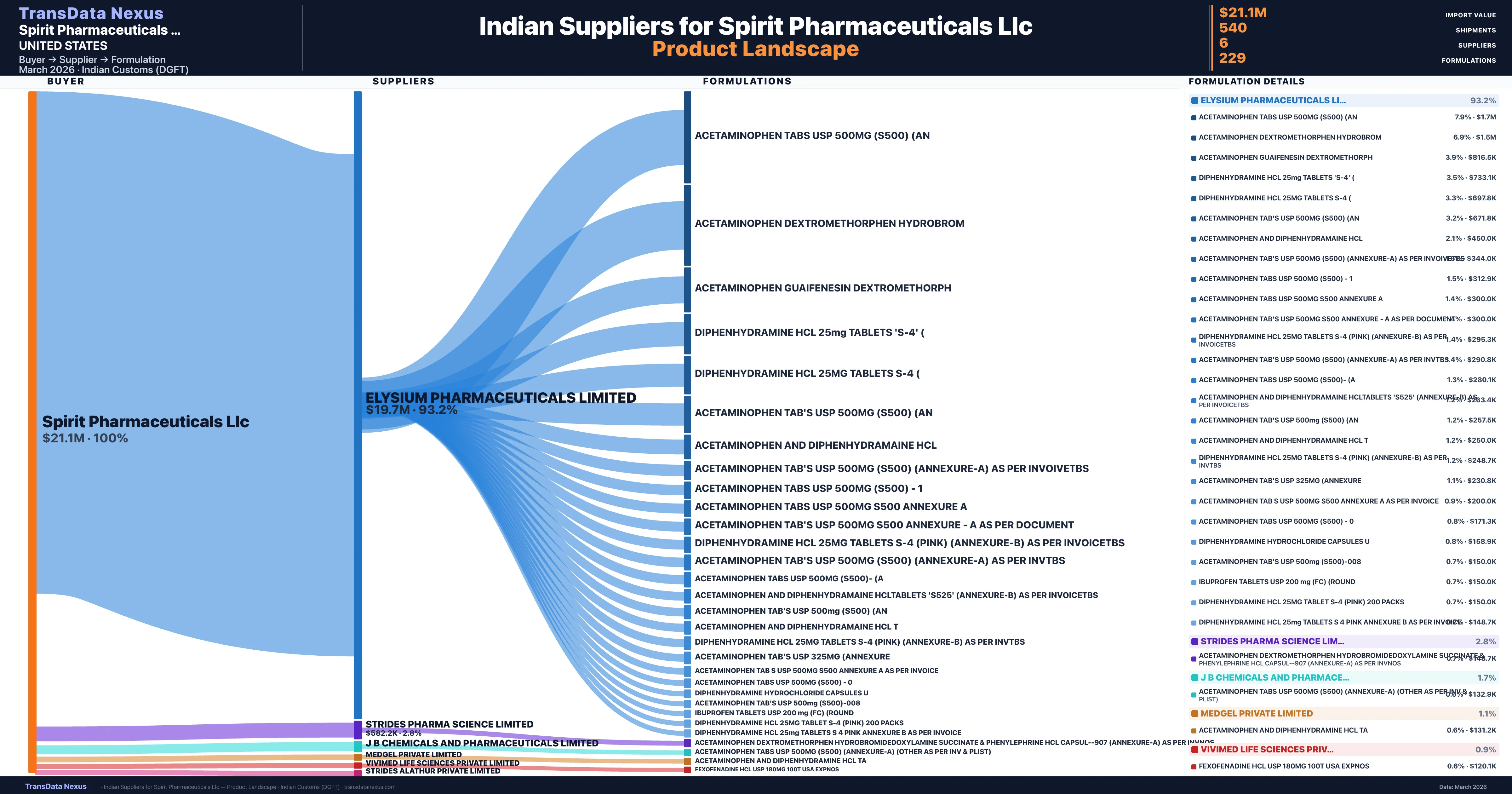 Spirit Pharmaceuticals Llc sources from 6 verified Indian suppliers. The primary supplier is Elysium Pharmaceuticals Limited (93.2% of imports, $19.7M).
