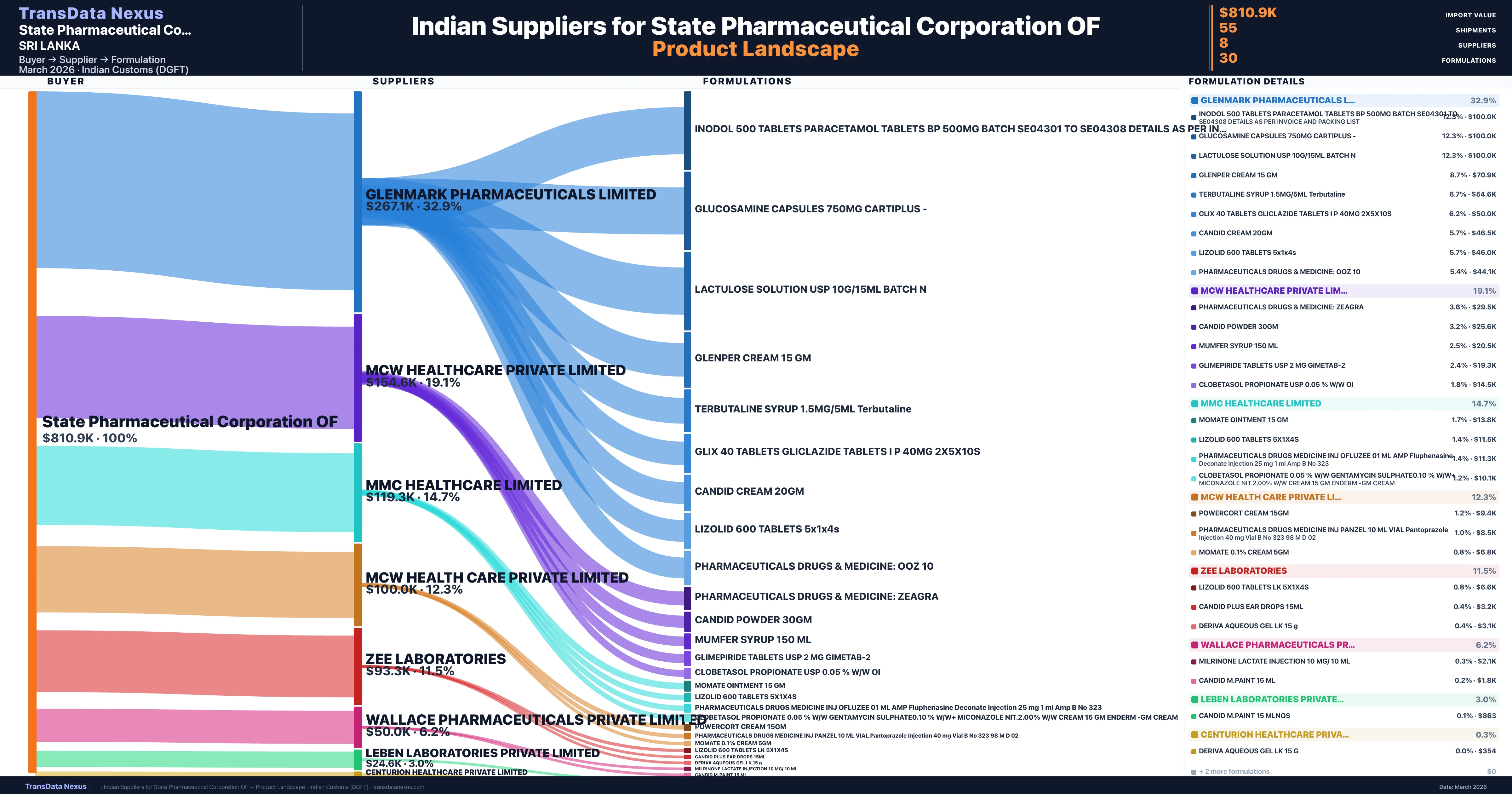 State Pharmaceutical Corporation OF is a pharmaceutical importer based in Sri Lanka with a total trade value of $154.6K across 2 products in 2 therapeutic categories. Based on 5 verified import shipments from Indian Customs (DGFT) records, the company actively imports across multiple product segments. State Pharmaceutical Corporation OF sources from 8 verified Indian suppliers, with Glenmark Pharmaceuticals Limited accounting for 32.9% of imports.