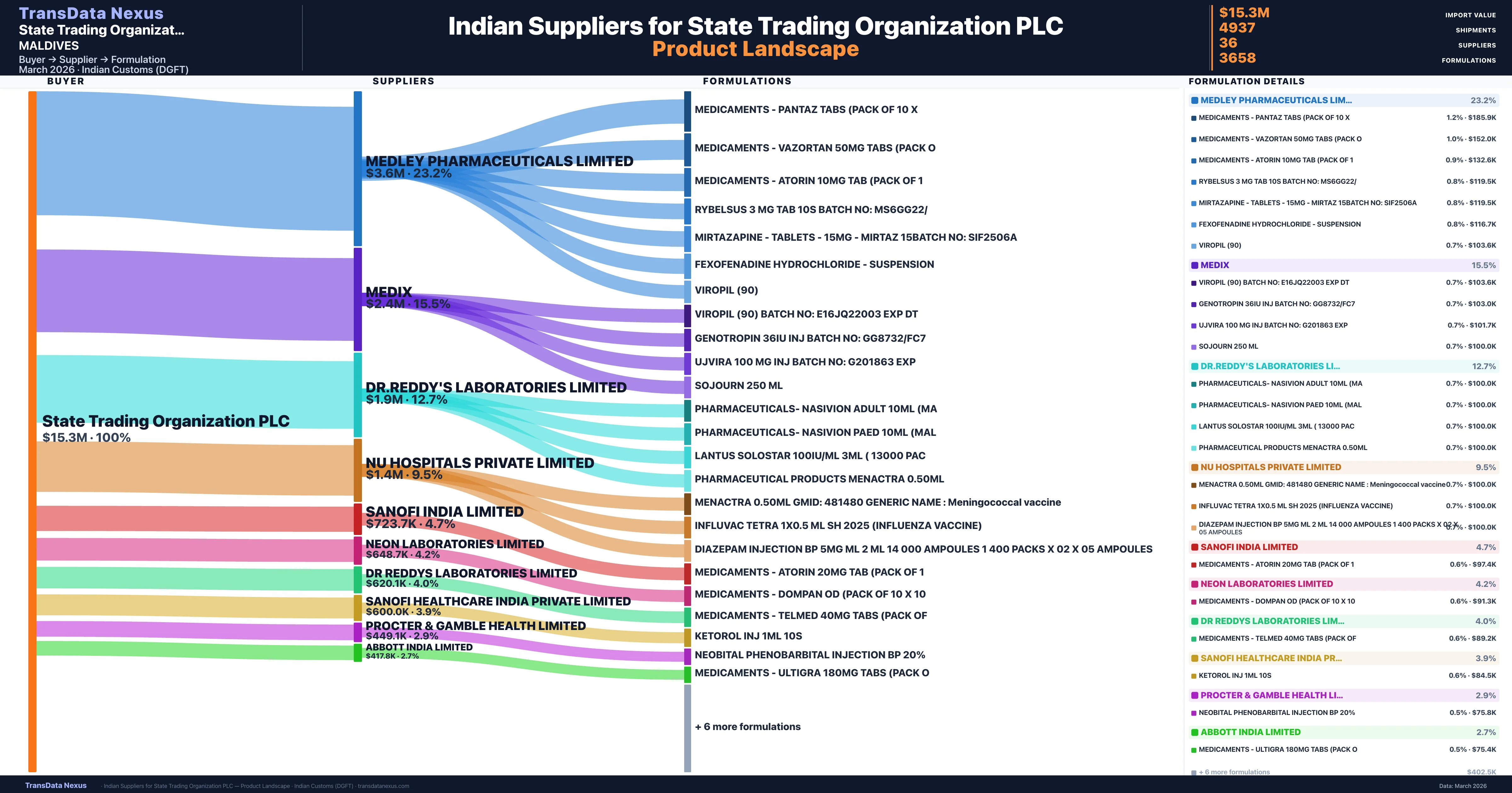 State Trading Organization PLC sources from 36 verified Indian suppliers across 3,658 distinct formulations. The supply base is diversified across 36 suppliers, reducing single-source dependency risk.