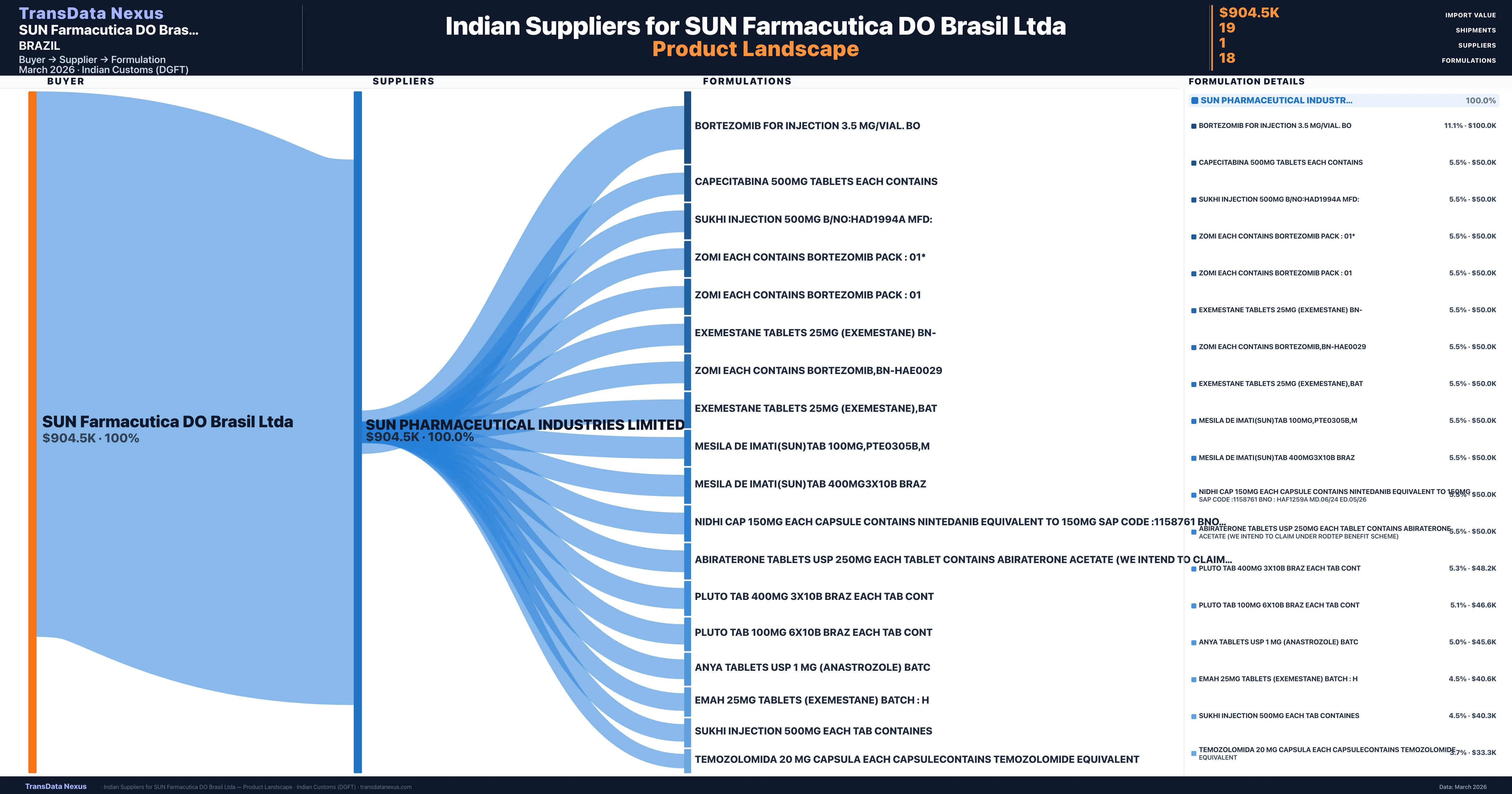 SUN Farmacutica DO Brasil Ltda sources from 1 verified Indian supplier across 18 distinct formulations. The sourcing is highly concentrated â Sun Pharmaceutical Industries Limited accounts for 100.0% of total imports, indicating a strategic single-source relationship.