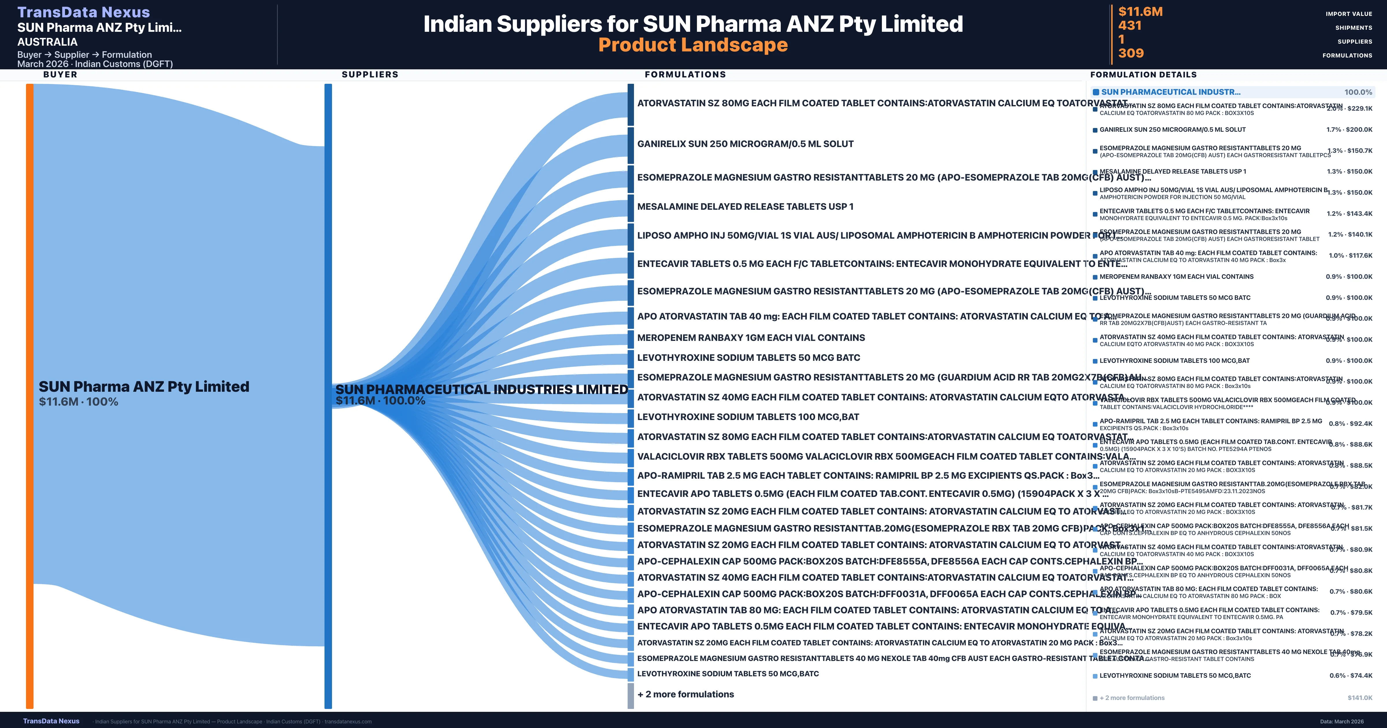 SUN Pharma ANZ Pty Limited sources from 1 verified Indian suppliers. The primary supplier is Sun Pharmaceutical Industries Limited (100.0% of imports, $11.6M).