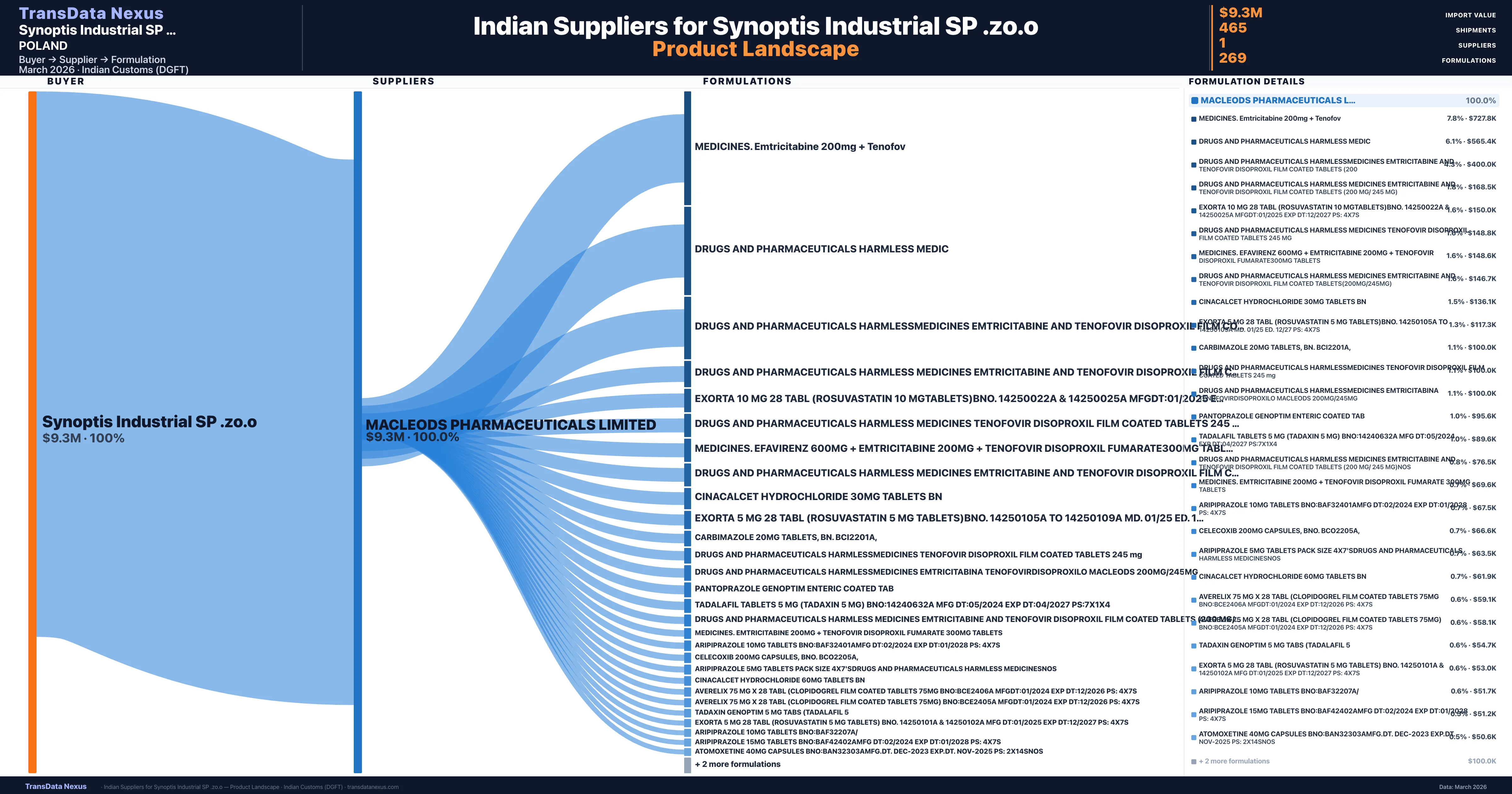 Synoptis Industrial SP .zo.o sources from 1 verified Indian suppliers. The primary supplier is Macleods Pharmaceuticals Limited (100.0% of imports, $9.3M).