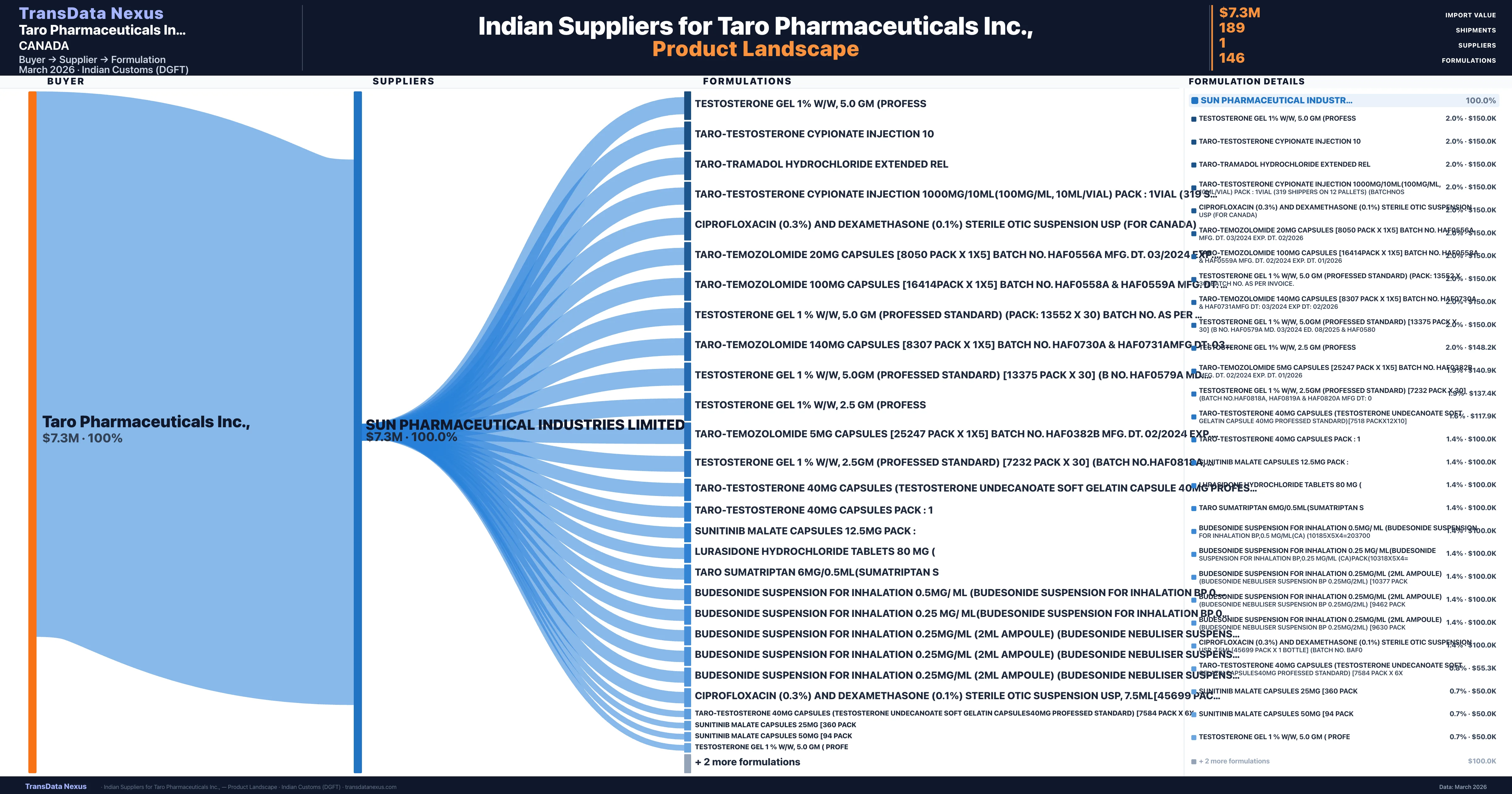 Taro Pharmaceuticals Inc., sources from 1 verified Indian supplier across 146 distinct formulations. The sourcing is highly concentrated — Sun Pharmaceutical Industries Limited accounts for 100.0% of total imports, indicating a strategic single-source relationship.