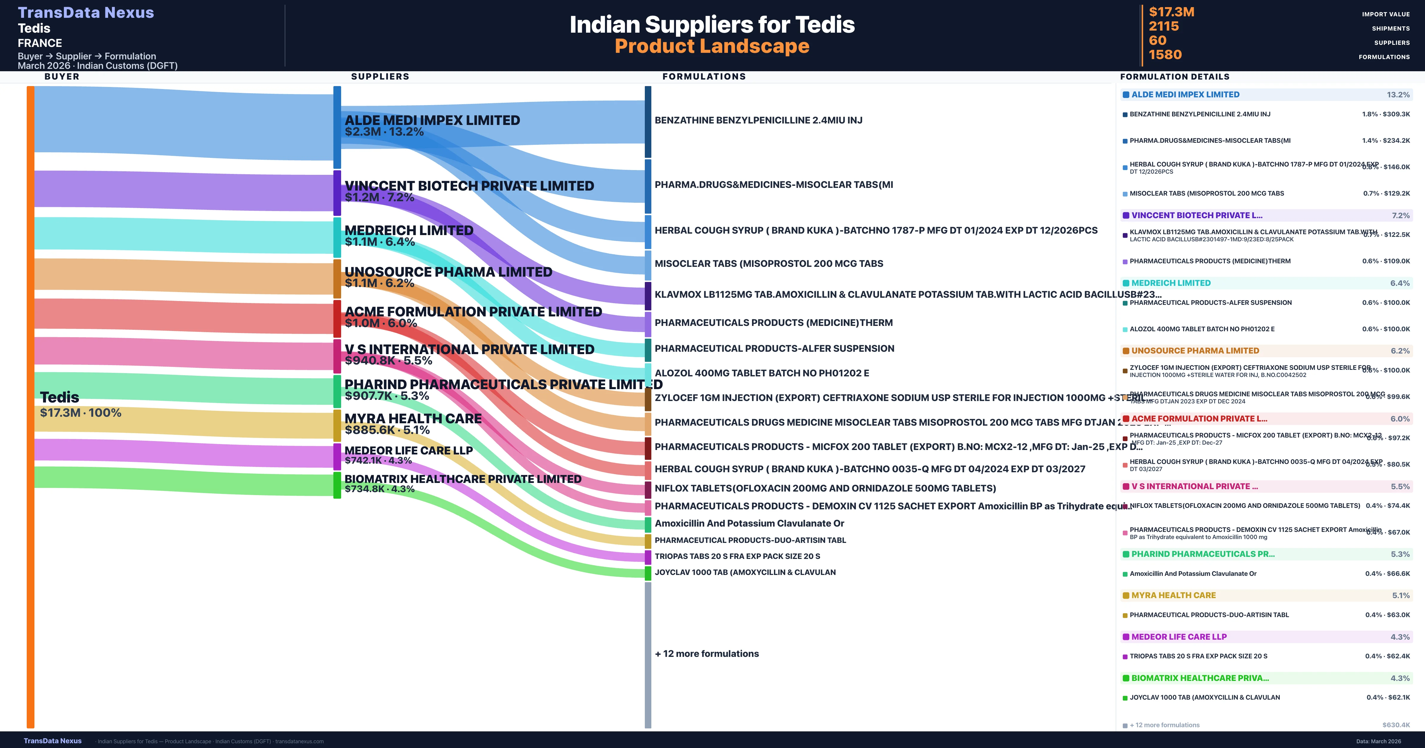Tedis is a pharmaceutical importer based in France with a total trade value of $1.8M across 2 products in 1 therapeutic categories. Based on 48 verified import shipments from Indian Customs (DGFT) records, Tedis is the #1 buyer in 1 product including Benzylpenicillin. Tedis sources from 60 verified Indian suppliers, with Alde Medi Impex Limited accounting for 13.2% of imports.