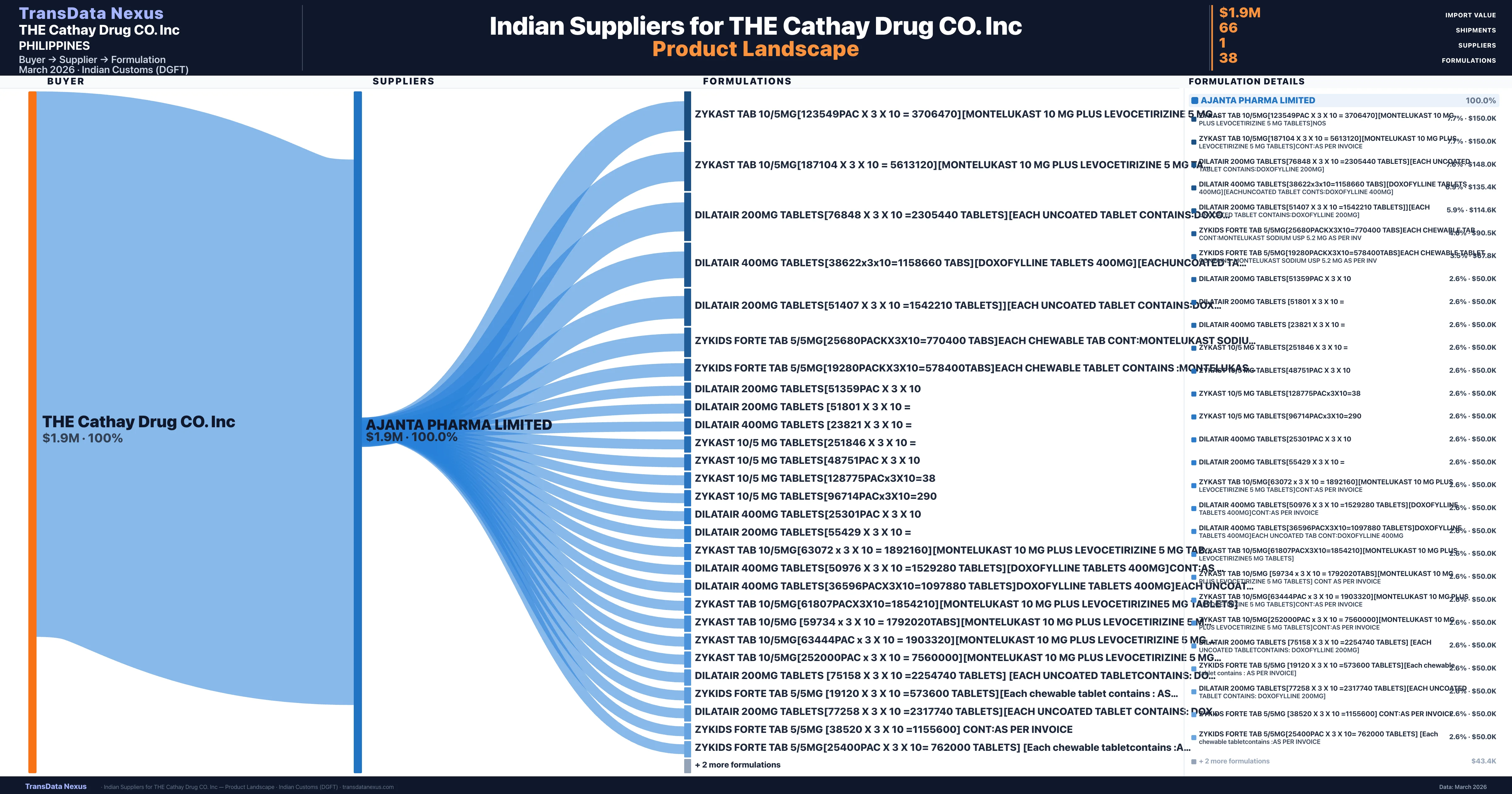 THE Cathay Drug CO. Inc sources from 1 verified Indian supplier across 38 distinct formulations. The sourcing is highly concentrated β Ajanta Pharma Limited accounts for 100.0% of total imports, indicating a strategic single-source relationship.