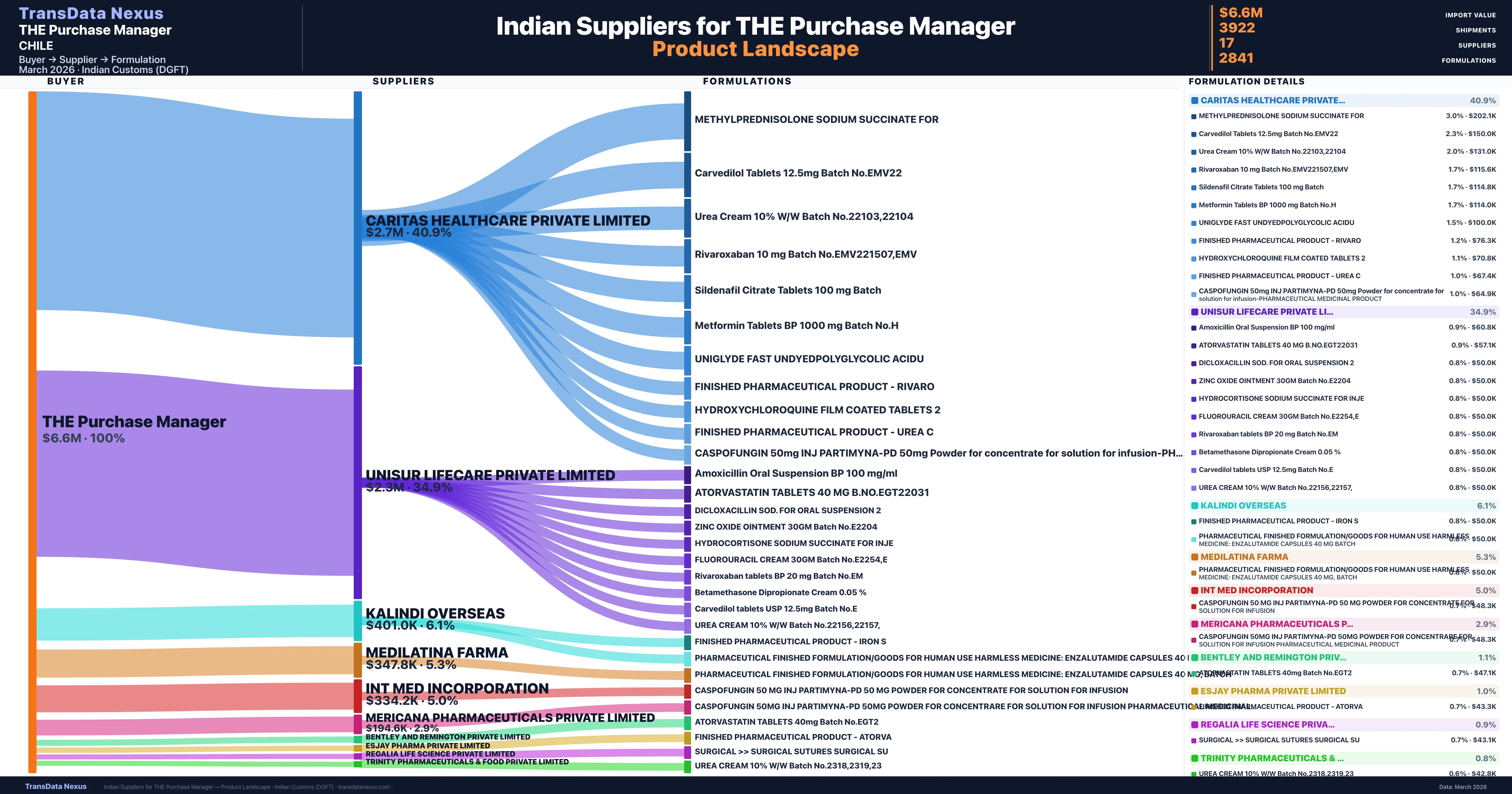 THE Purchase Manager is a pharmaceutical importer based in Chile with a total trade value of $76.1K across 2 products in 2 therapeutic categories. Based on 15 verified import shipments from Indian Customs (DGFT) records, the company actively imports across multiple product segments. THE Purchase Manager sources from 17 verified Indian suppliers, with Caritas Healthcare Private Limited accounting for 40.9% of imports.