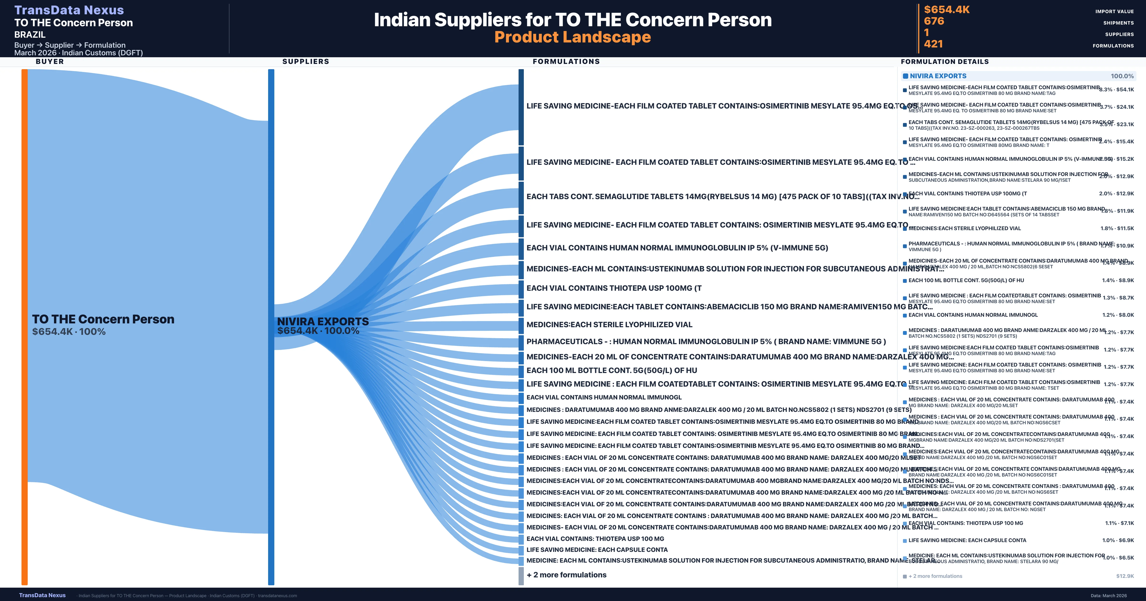 TO THE Concern Person sources from 1 verified Indian supplier across 421 distinct formulations. The sourcing is highly concentrated — Nivira Exports accounts for 100.0% of total imports, indicating a strategic single-source relationship.