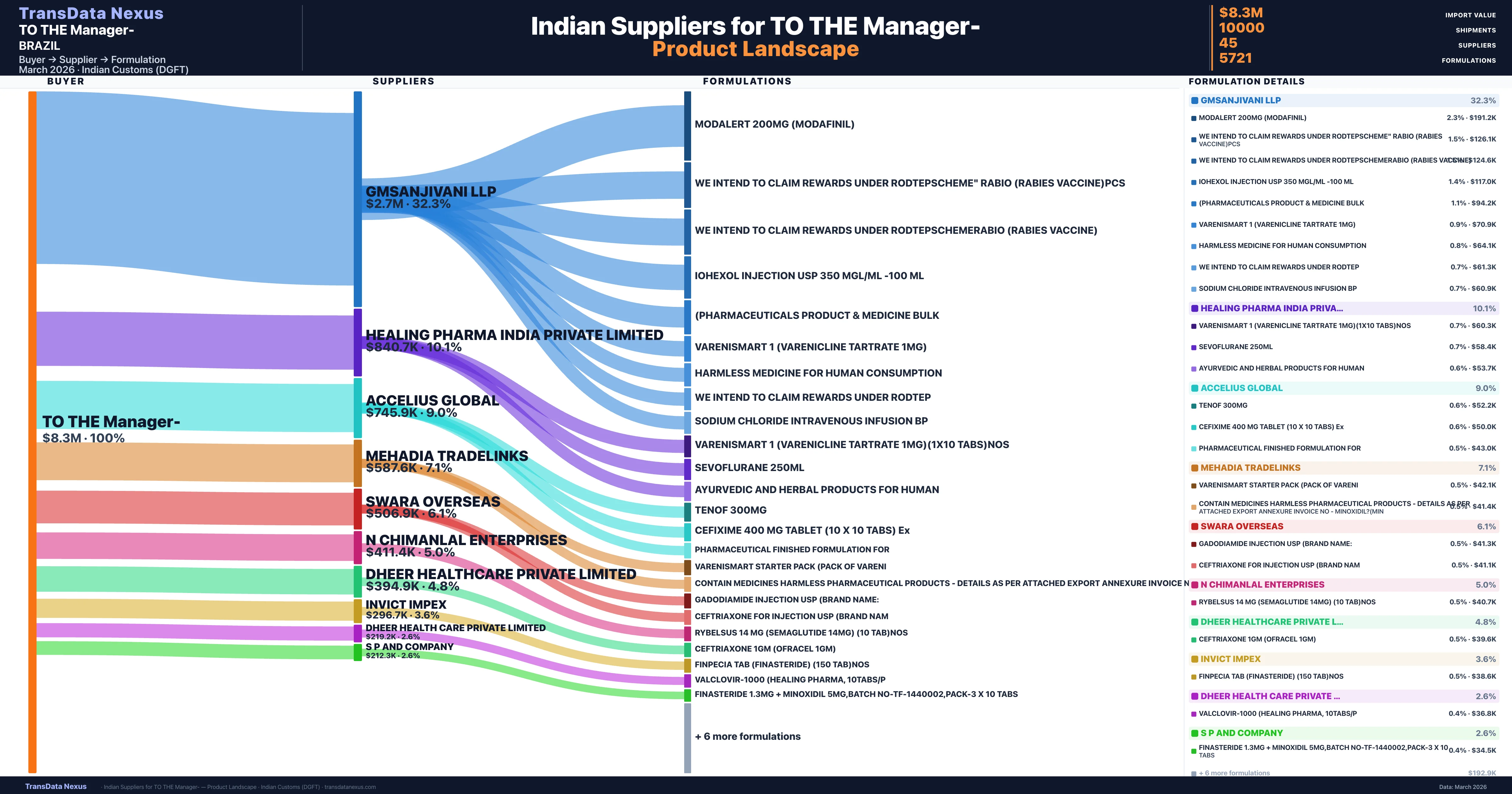 TO THE Manager- is a pharmaceutical importer based in Brazil with a total trade value of $94.6K across 4 products in 2 therapeutic categories. Based on 38 verified import shipments from Indian Customs (DGFT) records, the company actively imports across multiple product segments. TO THE Manager- sources from 45 verified Indian suppliers, with Gmsanjivani Llp accounting for 32.3% of imports.