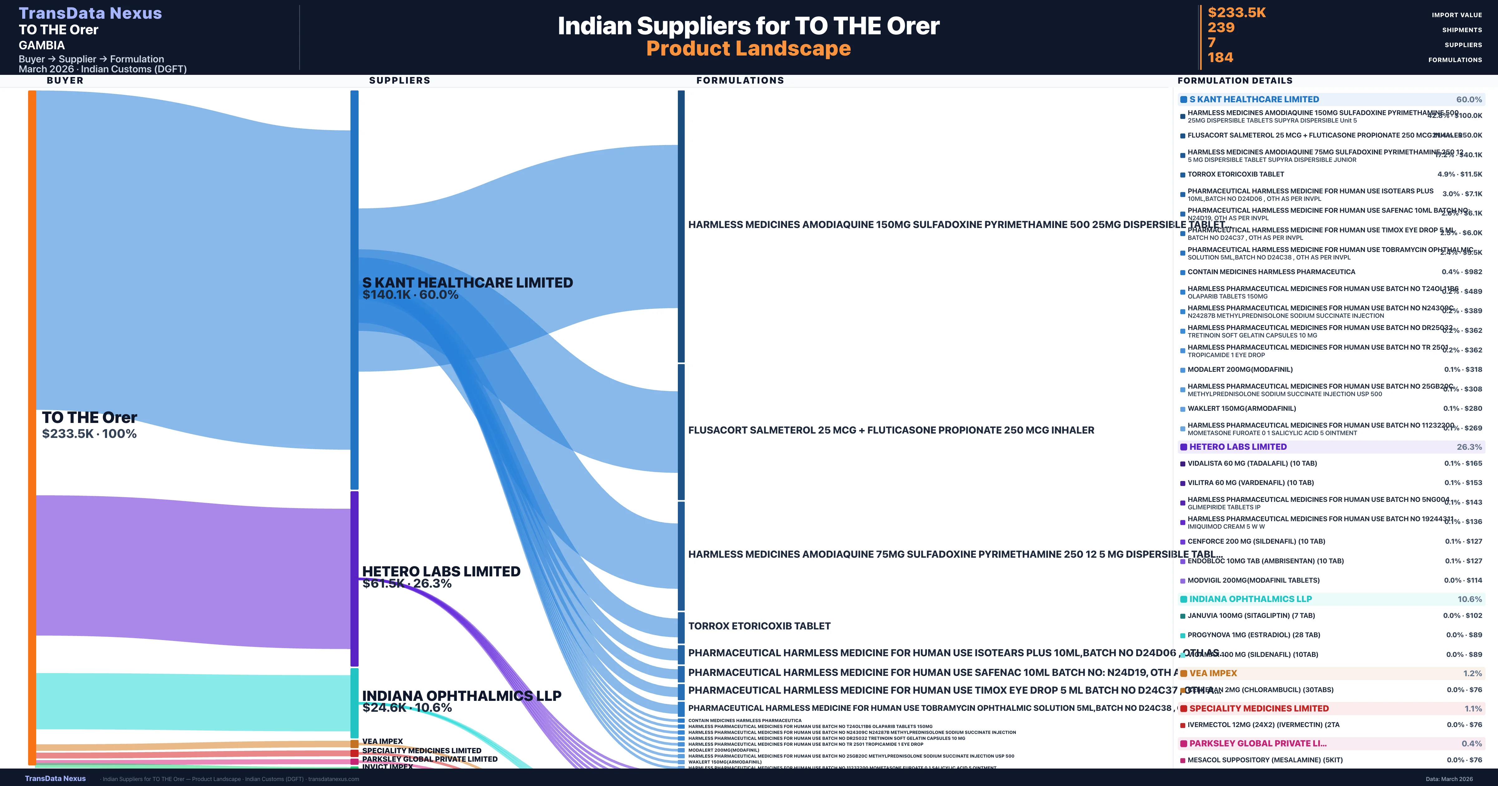 TO THE Orer is a pharmaceutical importer based in Gambia with a total trade value of $400.0K across 2 products in 1 therapeutic categories. Based on 8 verified import shipments from Indian Customs (DGFT) records, the company actively imports across multiple product segments. TO THE Orer sources from 7 verified Indian suppliers, with S Kant Healthcare Limited accounting for 60.0% of imports.