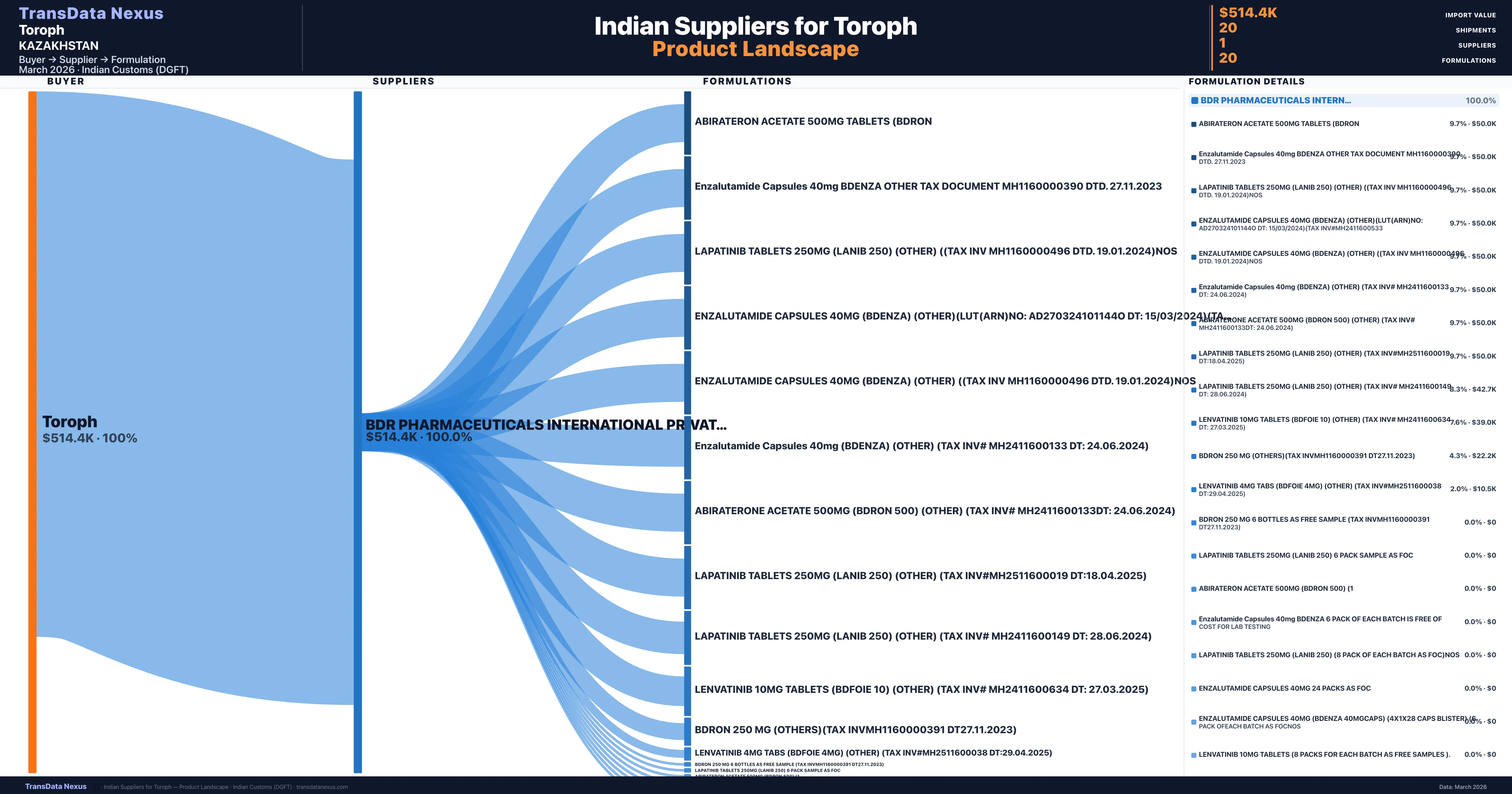 Toroph sources from 1 verified Indian supplier across 20 distinct formulations. The sourcing is highly concentrated β Bdr Pharmaceuticals International Private Limited accounts for 100.0% of total imports, indicating a strategic single-source relationship.