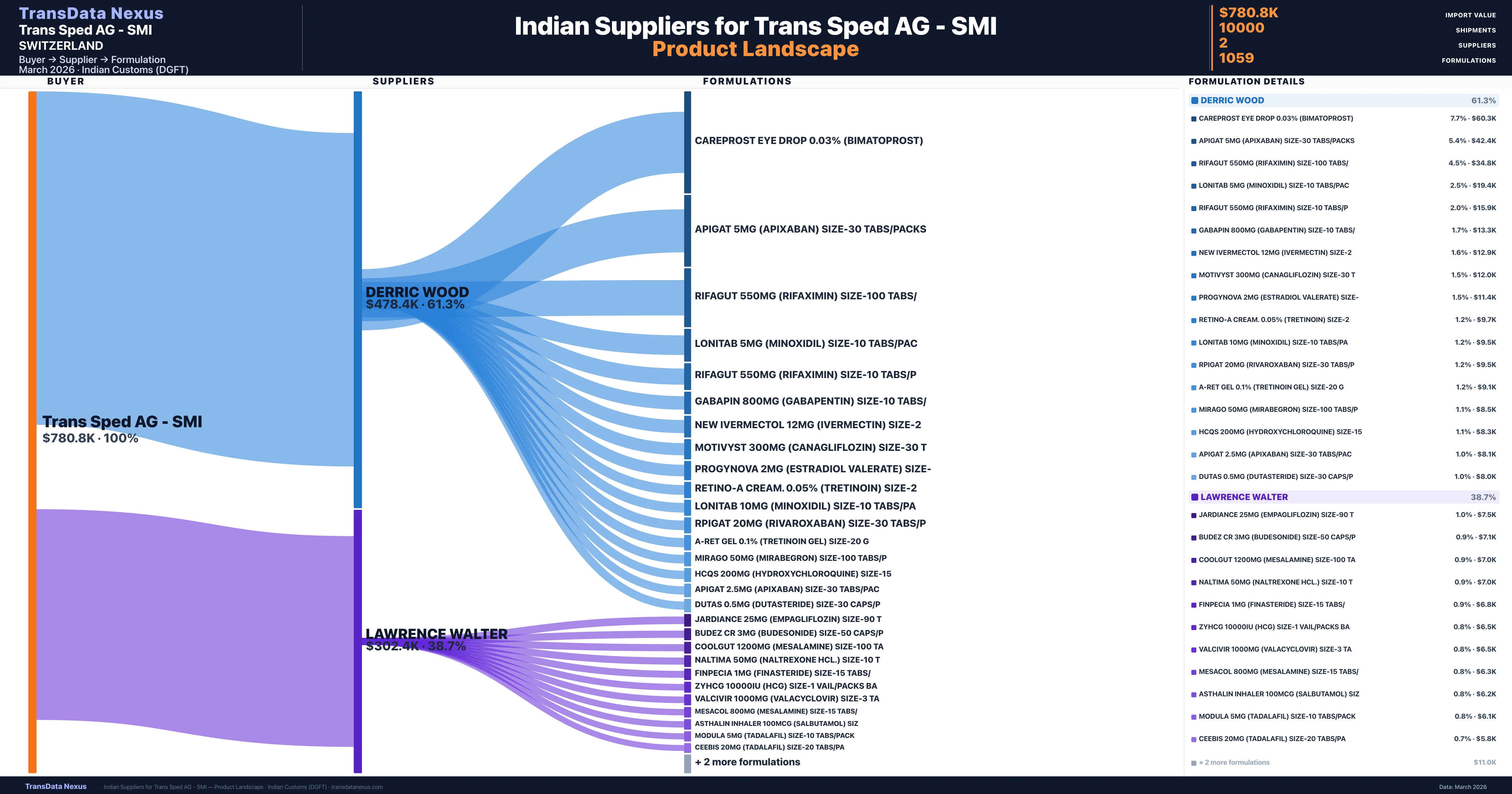 Trans Sped AG - SMI sources from 2 verified Indian suppliers across 1,059 distinct formulations. Total import value: $780.8K across 10,000 shipments.