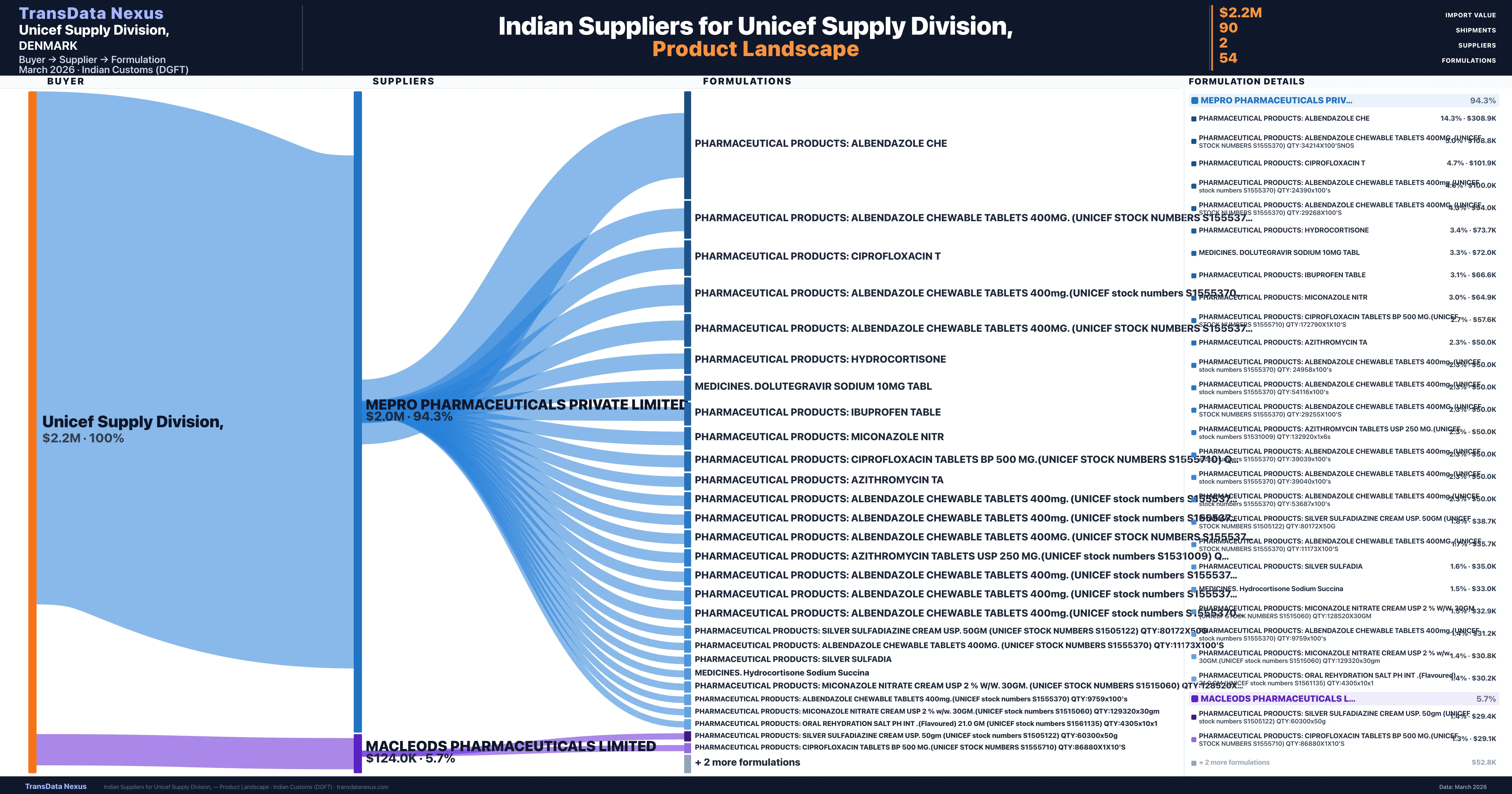 Unicef Supply Division, sources from 2 verified Indian suppliers across 54 distinct formulations. The sourcing is highly concentrated — Mepro Pharmaceuticals Private Limited accounts for 94.3% of total imports, indicating a strategic single-source relationship.