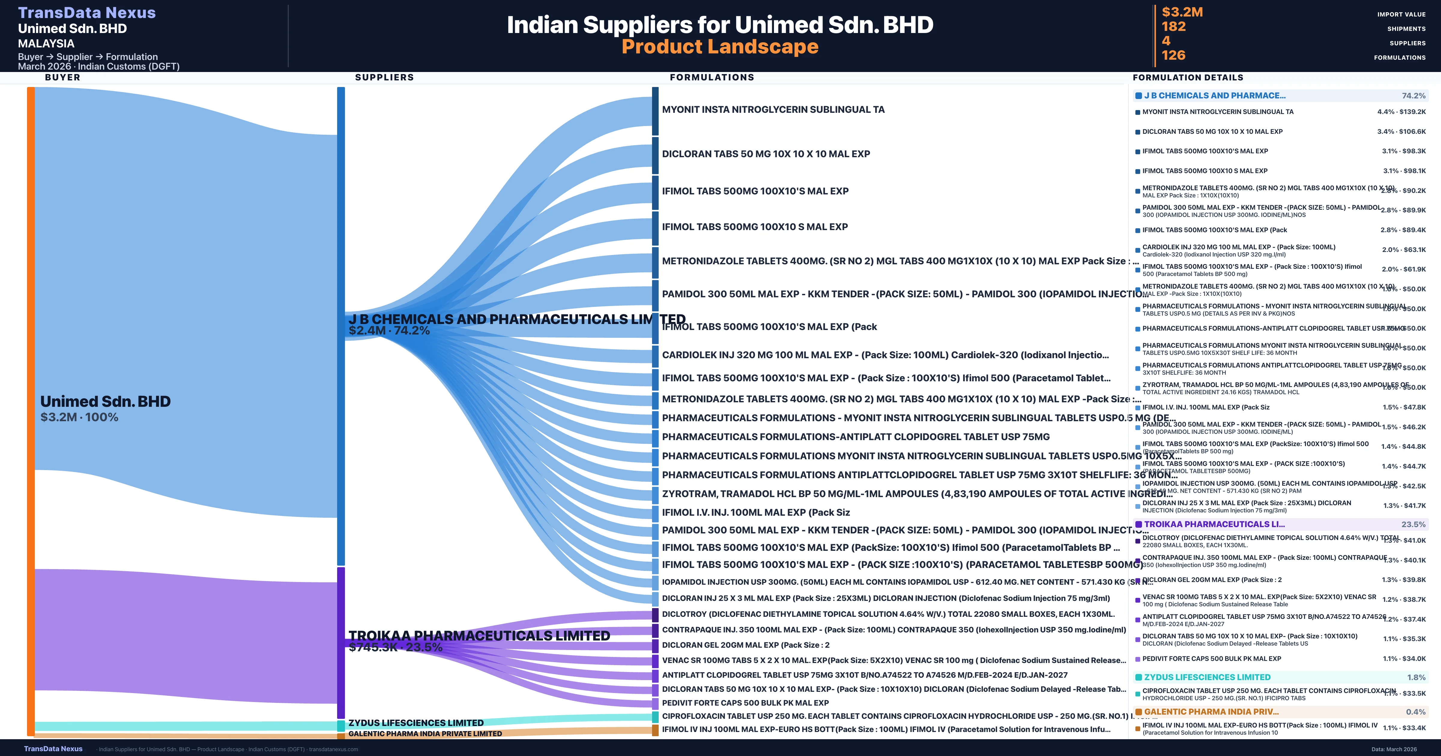 - 5.Supplier Verification: Unimed Sdn. BHD sources from 4 verified Indian suppliers across 126 formulations, confirmed from customs records.