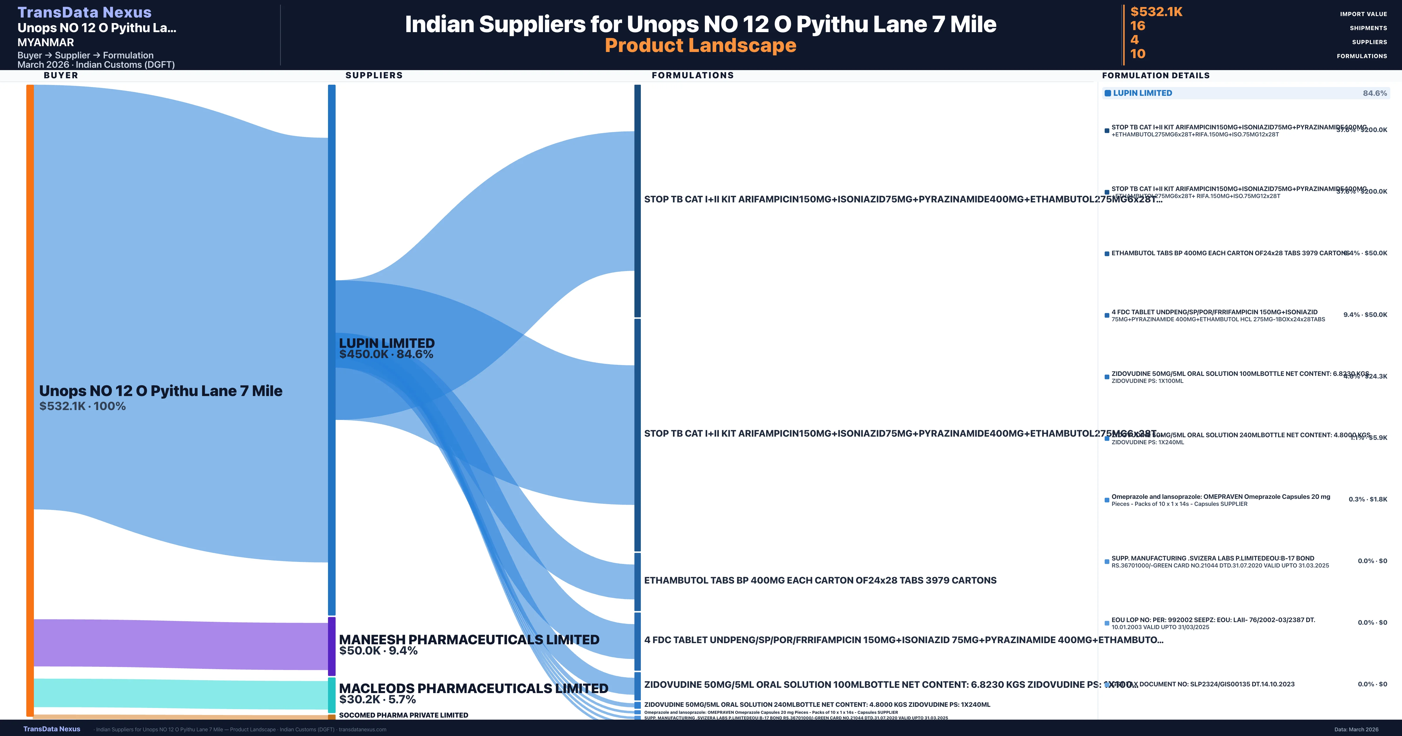 Unops NO 12 O Pyithu Lane 7 Mile is a pharmaceutical importer based in Myanmar with a total trade value of $950.0K across 2 products in 1 therapeutic categories. Based on 19 verified import shipments from Indian Customs (DGFT) records, the company actively imports across multiple product segments. Unops NO 12 O Pyithu Lane 7 Mile sources from 4 verified Indian suppliers, with Lupin Limited accounting for 84.6% of imports.