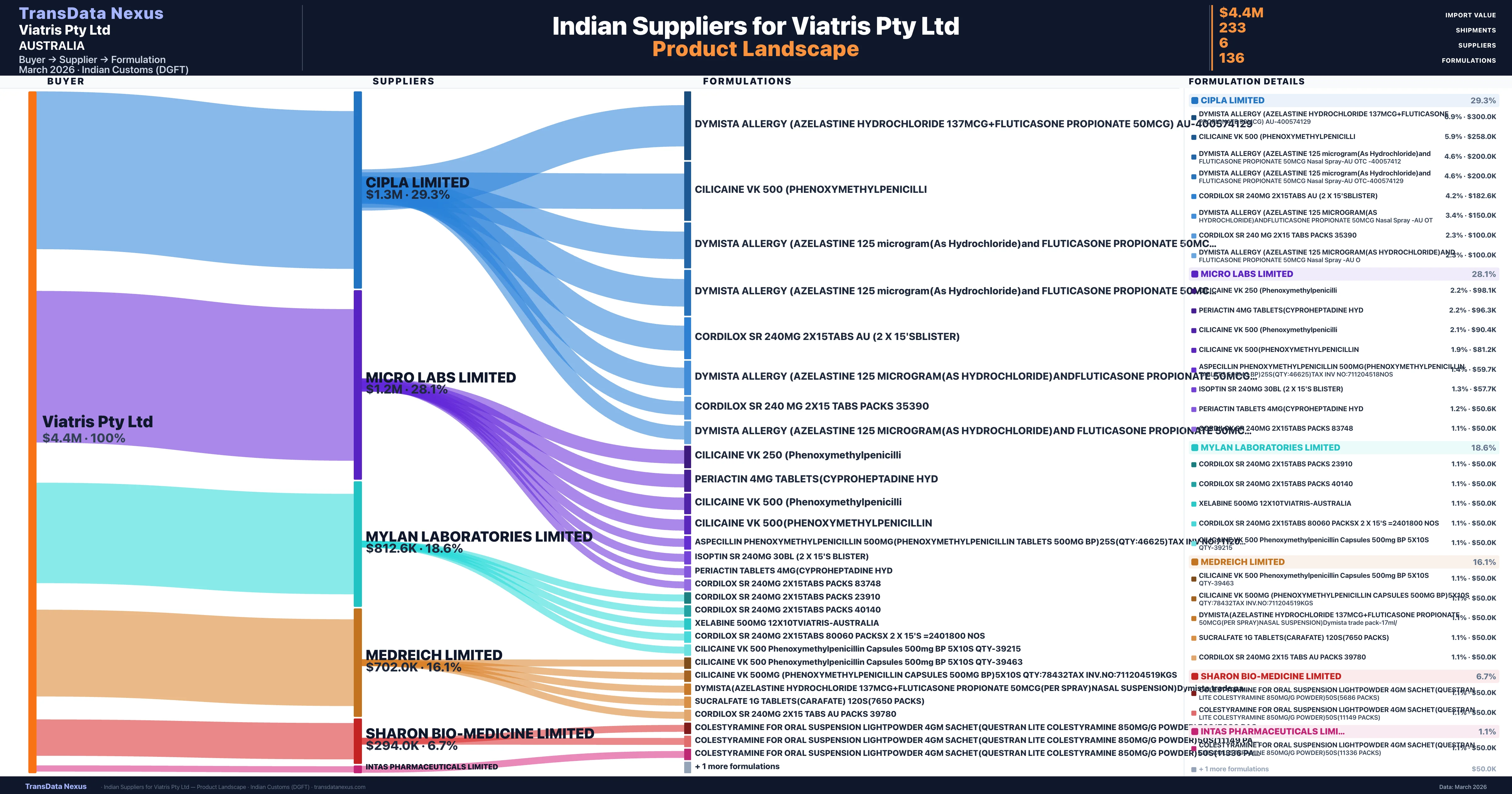 - 5.Supplier Verification: Viatris Pty Ltd sources from 6 verified Indian suppliers across 136 formulations, confirmed from customs records.