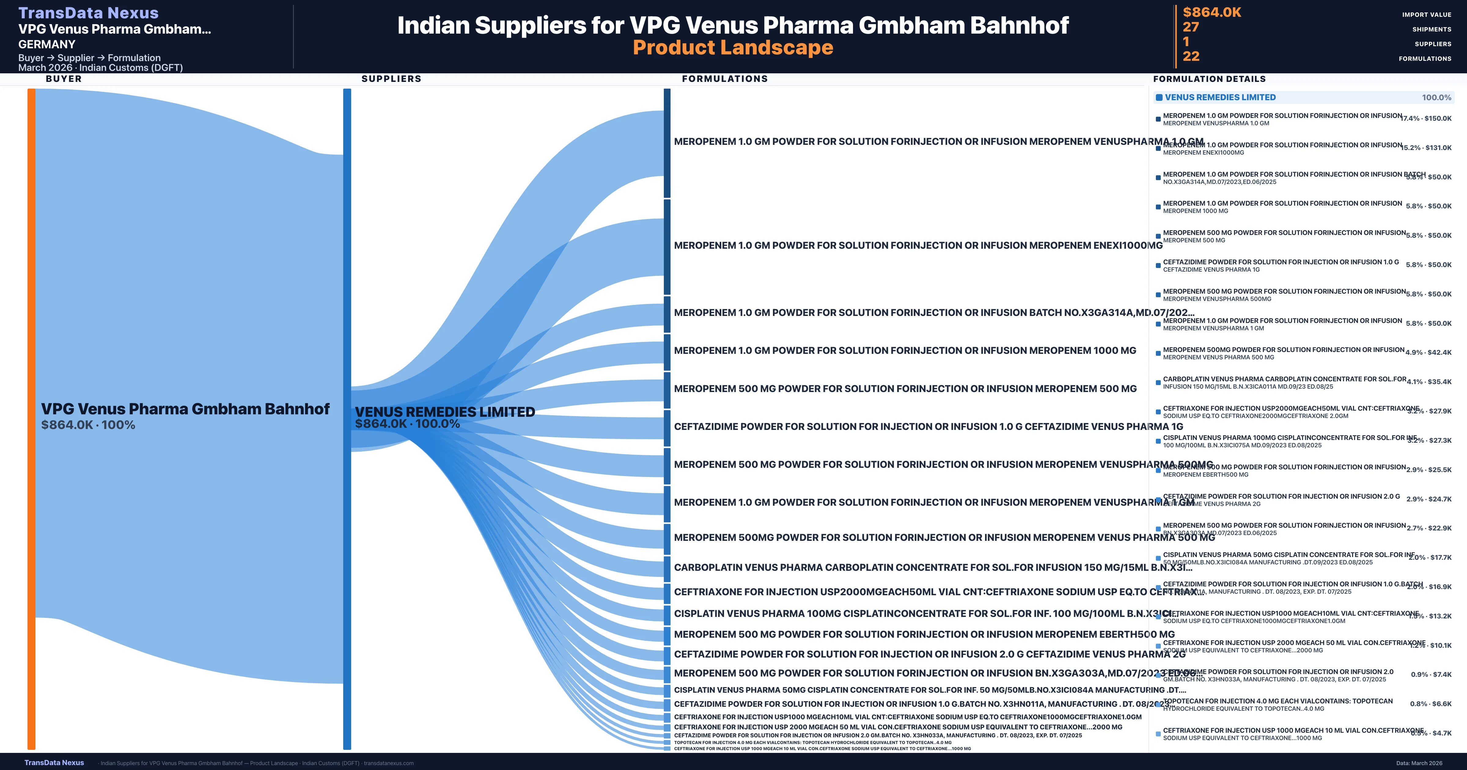 VPG Venus Pharma GmbH's sourcing pattern, characterized by a concentrated supplier base and a focused product portfolio, positions the company to leverage strong, long-term relationships with its supplier. This strategy may lead to favorable terms and streamlined operations. For Indian exporters, particularly those from Venus Remedies Limited, this presents an opportunity to strengthen their partnership with VPG Venus Pharma GmbH, potentially expanding their market presence in Germany. However, for other Indian exporters seeking to enter the German market, the existing supplier concentration may pose challenges in establishing new partnerships with VPG Venus Pharma GmbH.