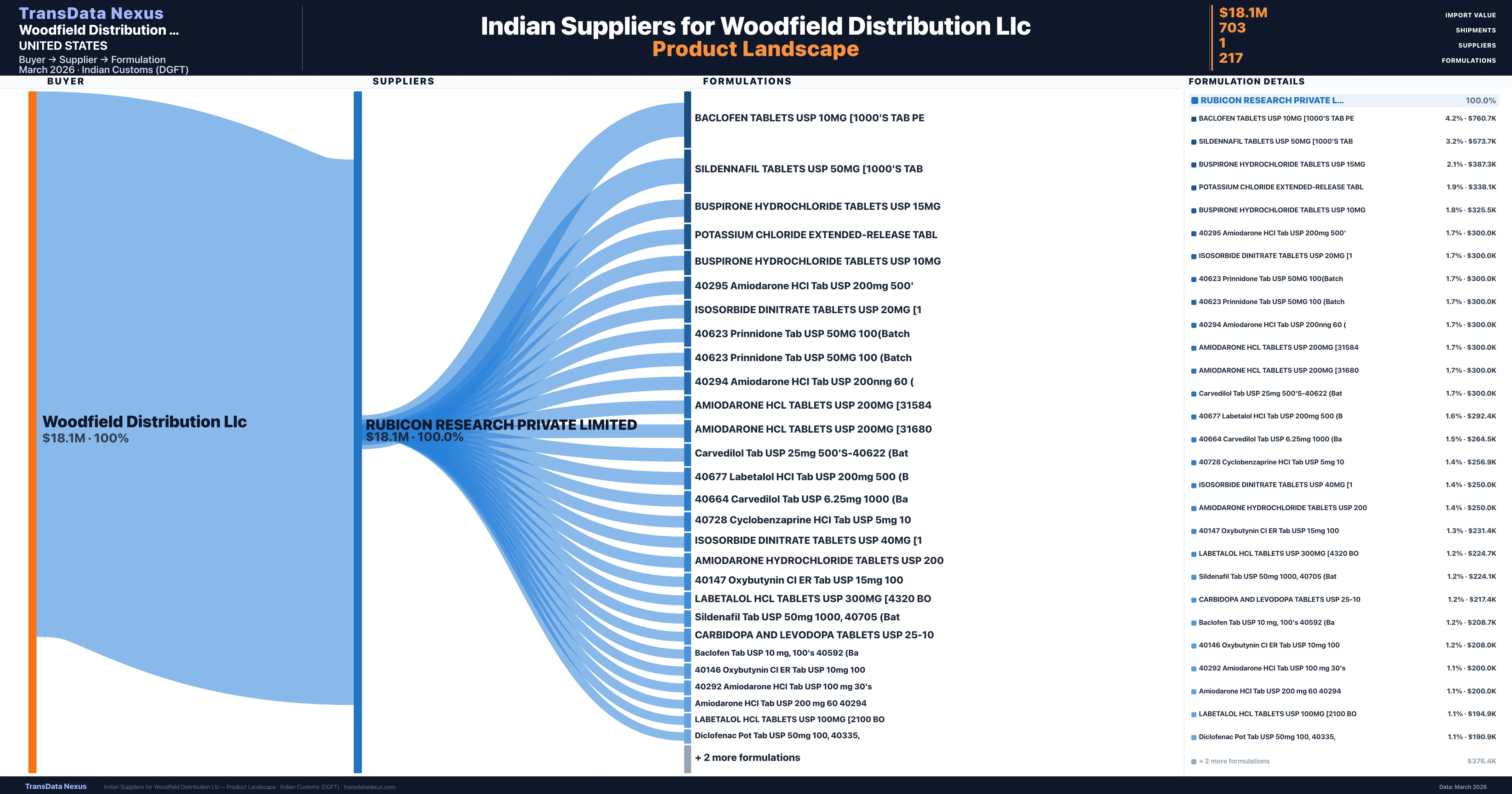 - 5.Supplier Verification: Woodfield Distribution Llc sources from 1 verified Indian suppliers across 217 formulations, confirmed from customs records.