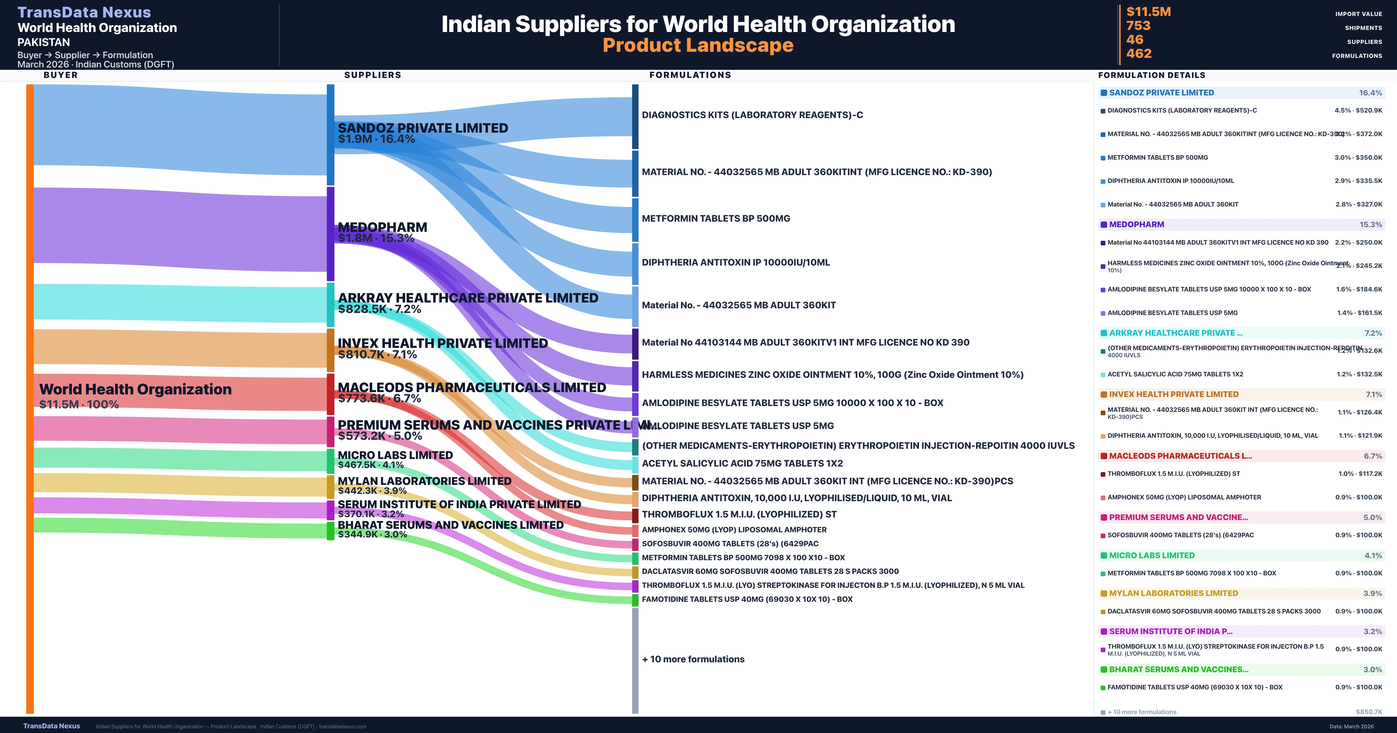 World Health Organization sources from 46 verified Indian suppliers. The primary supplier is Sandoz Private Limited (16.4% of imports, $1.9M).