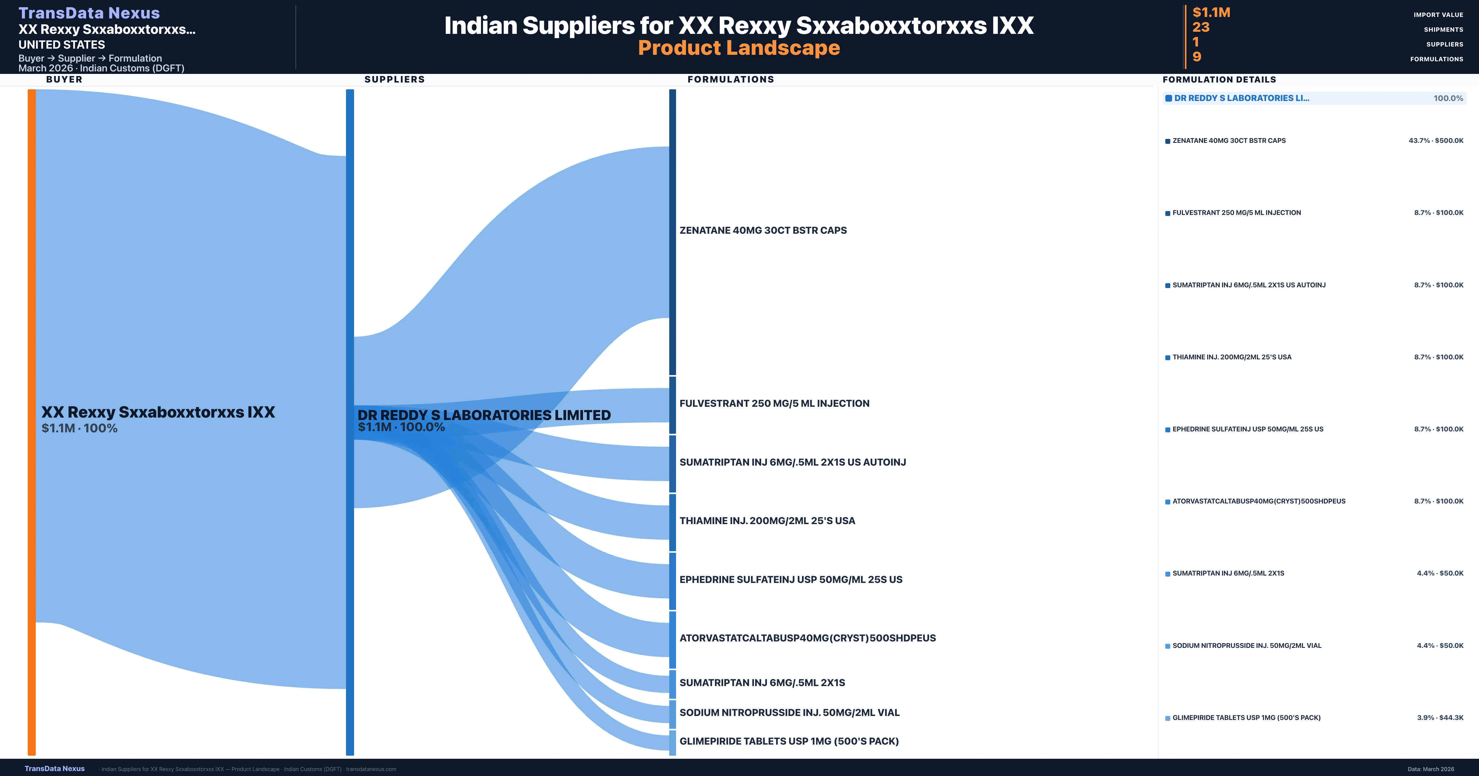 XX Rexxy Sxxaboxxtorxxs IXX sources from 1 verified Indian supplier across 9 distinct formulations. The sourcing is highly concentrated β Dr Reddy S Laboratories Limited accounts for 100.0% of total imports, indicating a strategic single-source relationship.