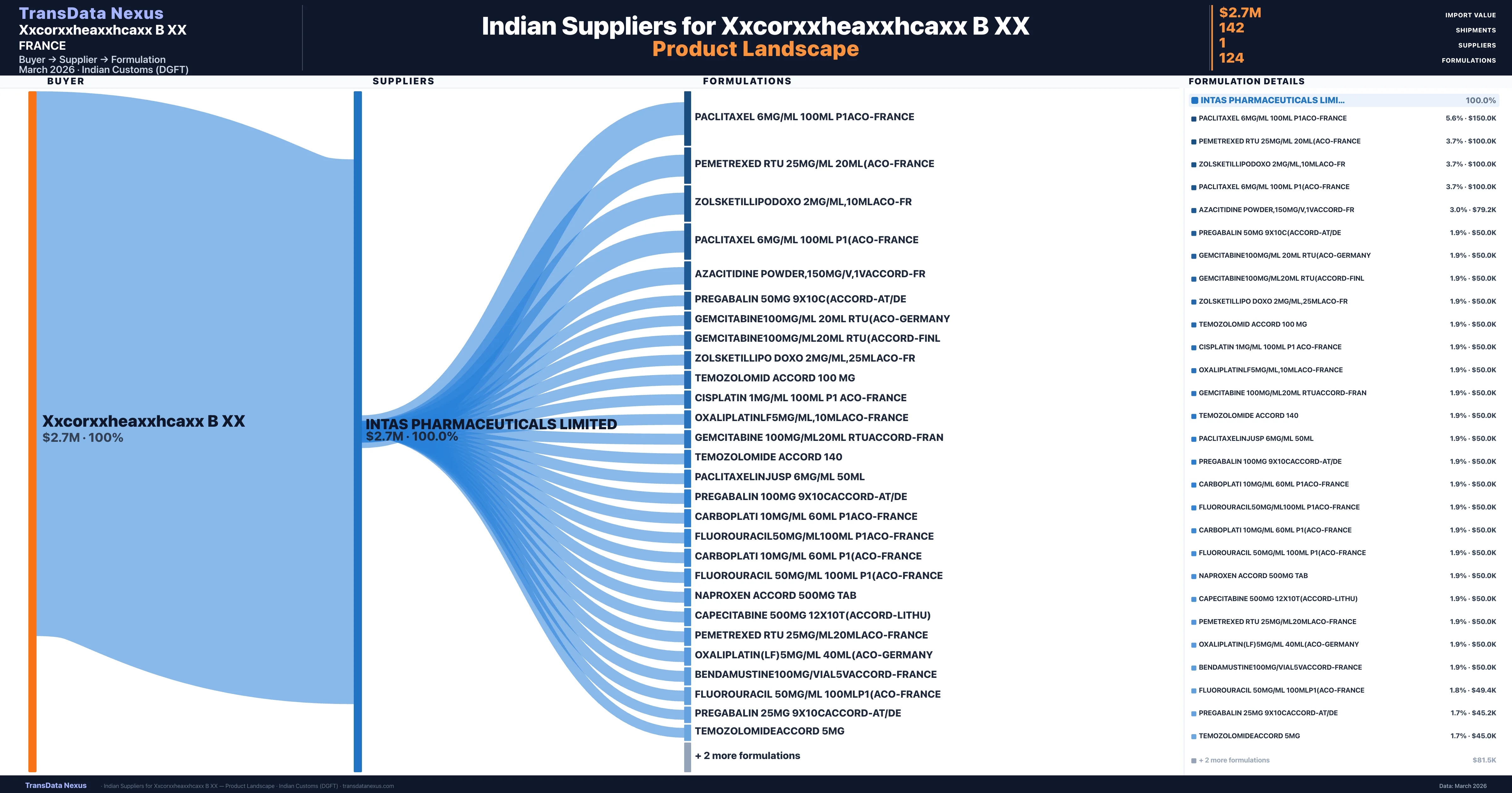 Xxcorxxheaxxhcaxx B XX sources from 1 verified Indian supplier across 124 distinct formulations. The sourcing is highly concentrated — Intas Pharmaceuticals Limited accounts for 100.0% of total imports, indicating a strategic single-source relationship.