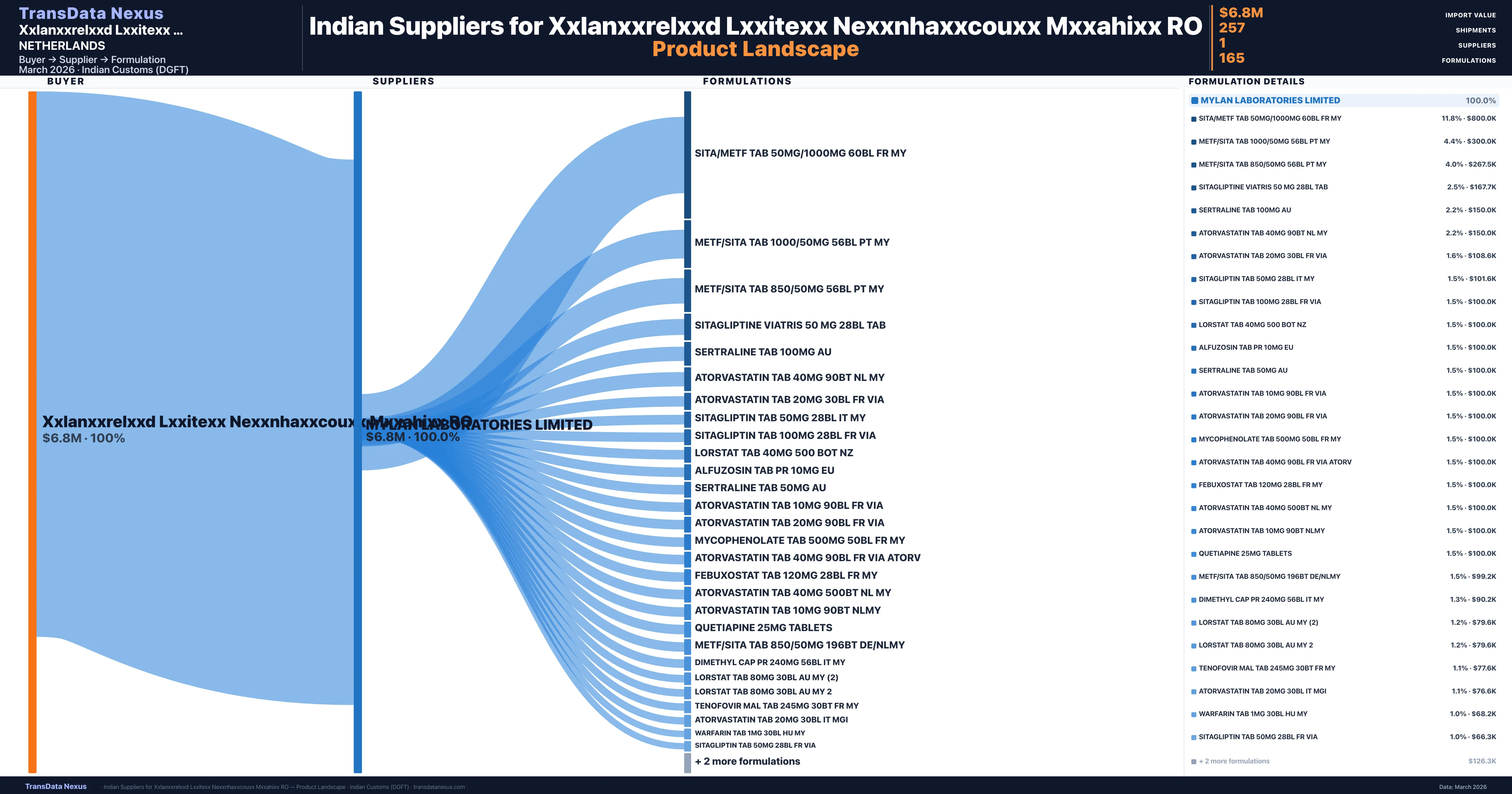Xxlanxxrelxxd Lxxitexx Nexxnhaxxcouxx Mxxahixx RO sources from 1 verified Indian supplier across 165 distinct formulations. The sourcing is highly concentrated — Mylan Laboratories Limited accounts for 100.0% of total imports, indicating a strategic single-source relationship.