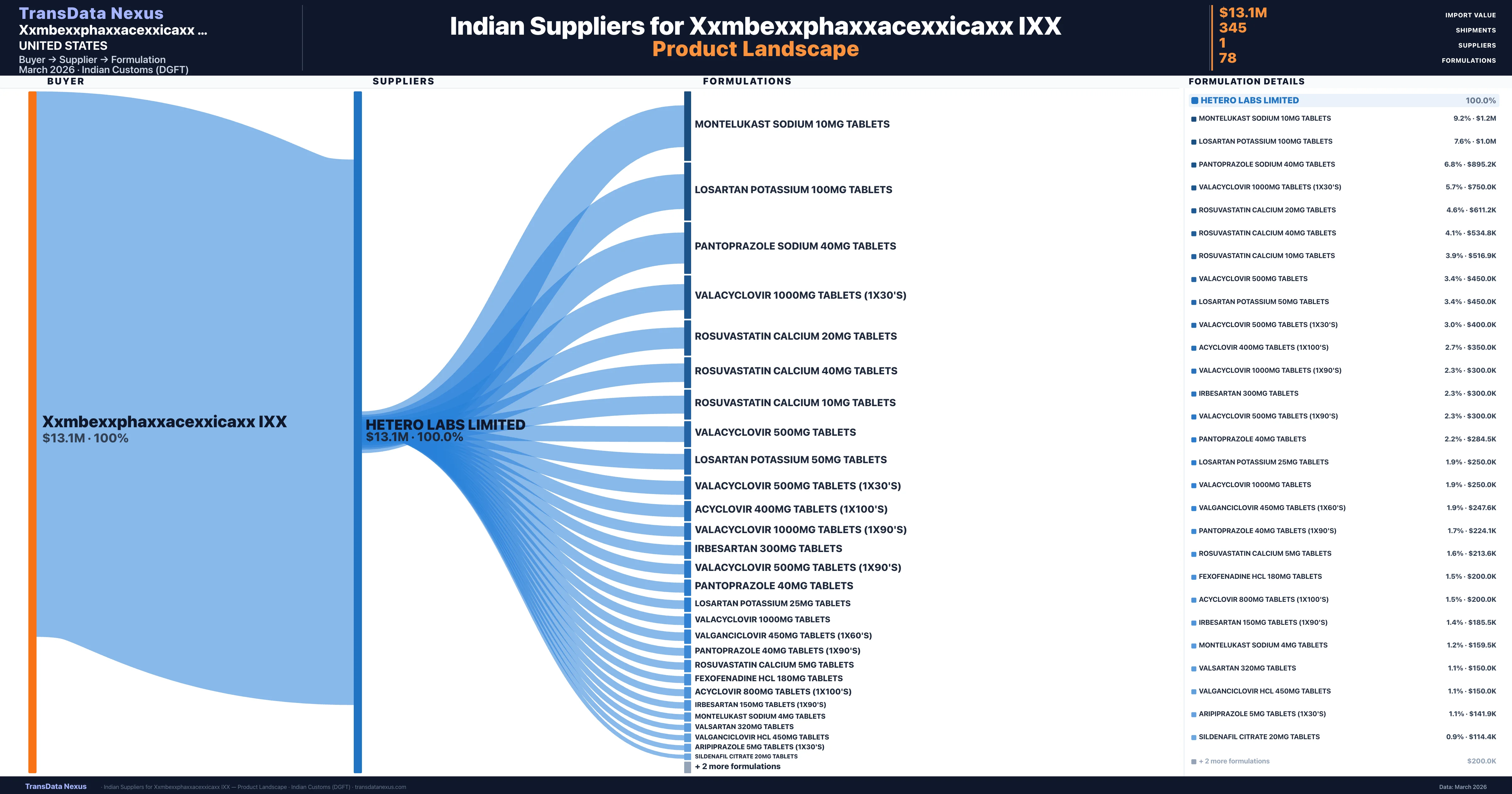 Xxmbexxphaxxacexxicaxx IXX sources from 1 verified Indian suppliers. The primary supplier is Hetero Labs Limited (100.0% of imports, $13.1M).