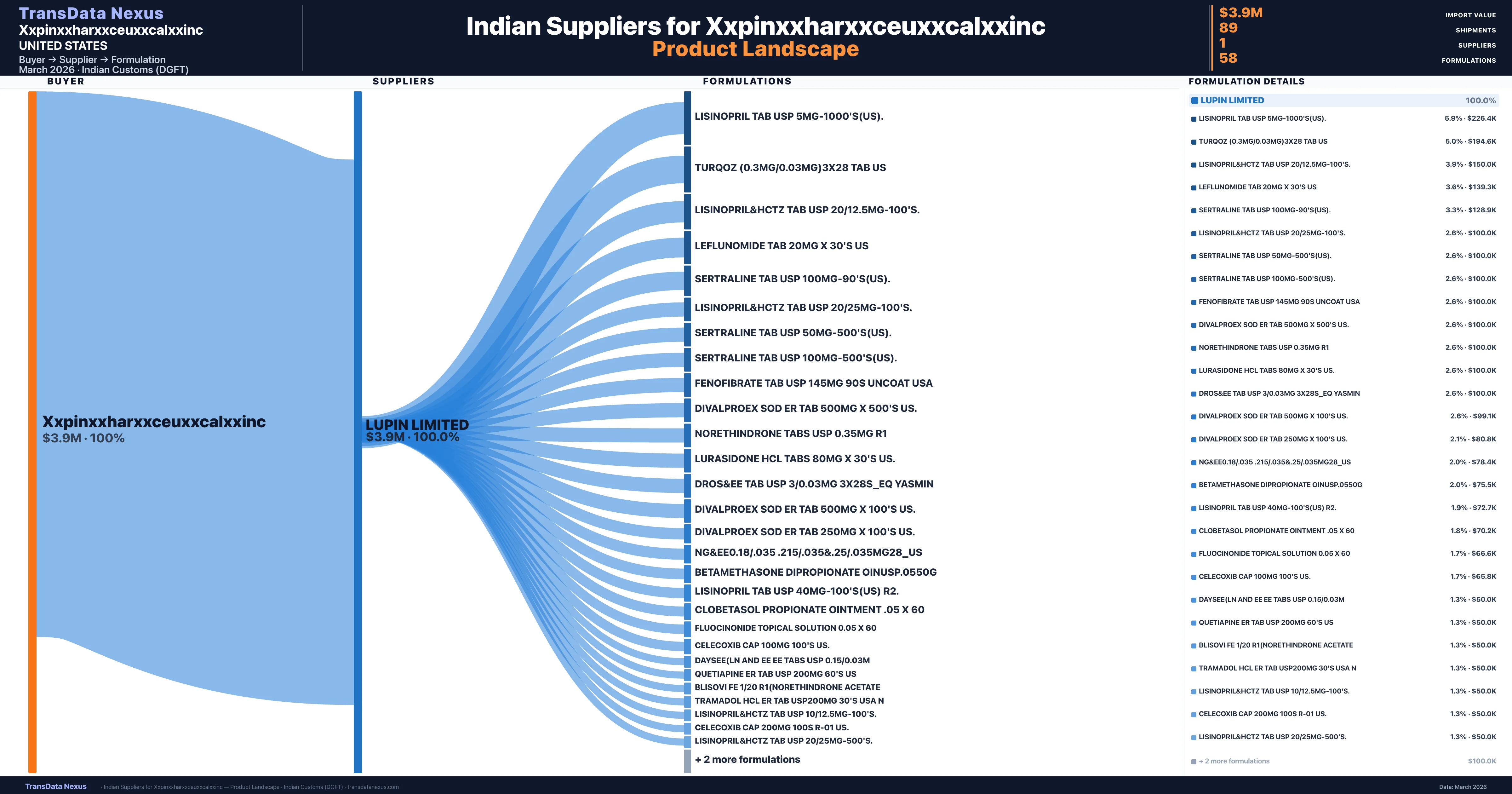Xxpinxxharxxceuxxcalxxinc sources from 1 verified Indian supplier across 58 distinct formulations. The sourcing is highly concentrated β Lupin Limited accounts for 100.0% of total imports, indicating a strategic single-source relationship.