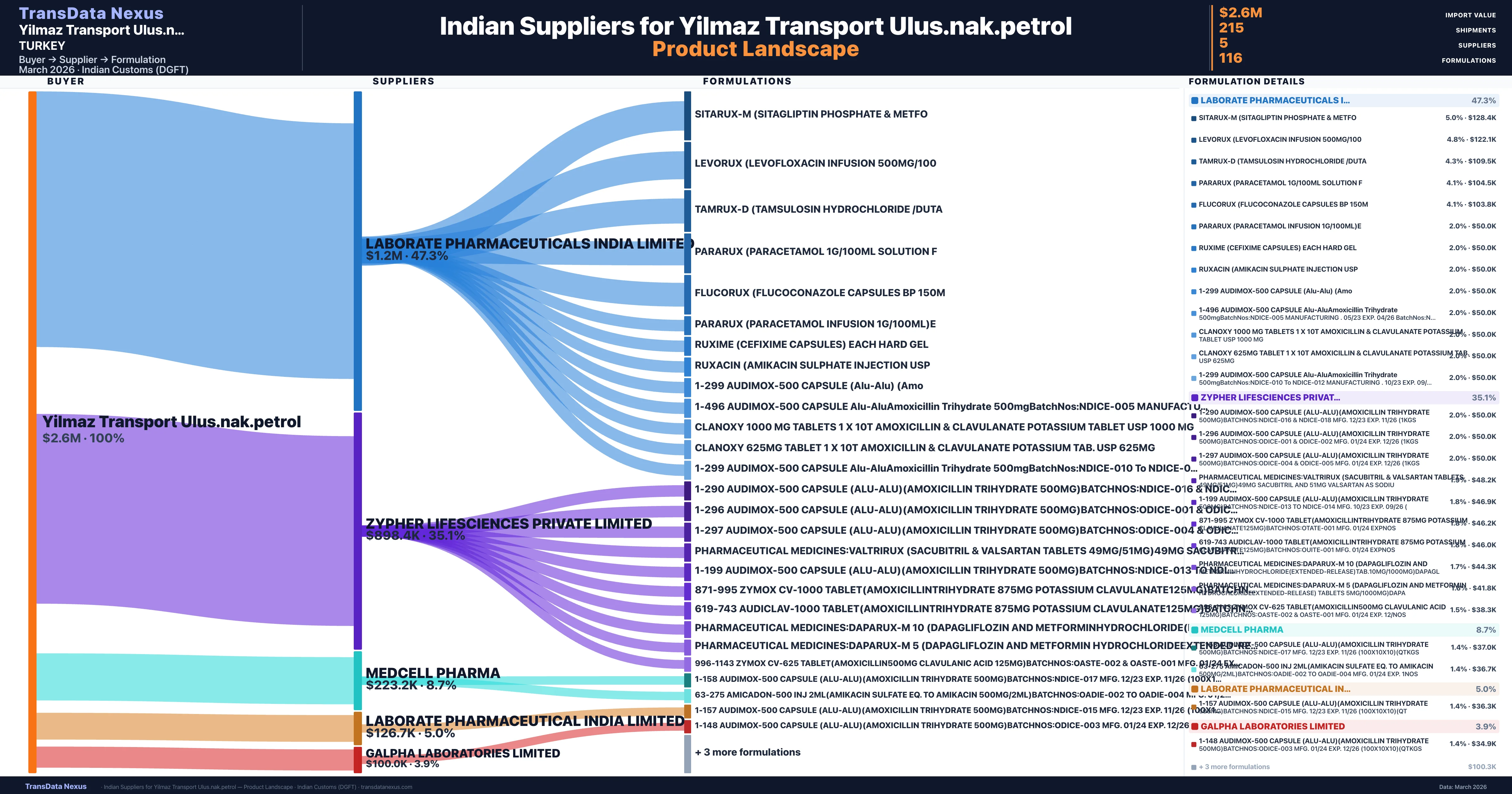 - 5.Supplier Verification: Yilmaz Transport Ulus.nak.petrol sources from 5 verified Indian suppliers across 116 formulations, confirmed from customs records.