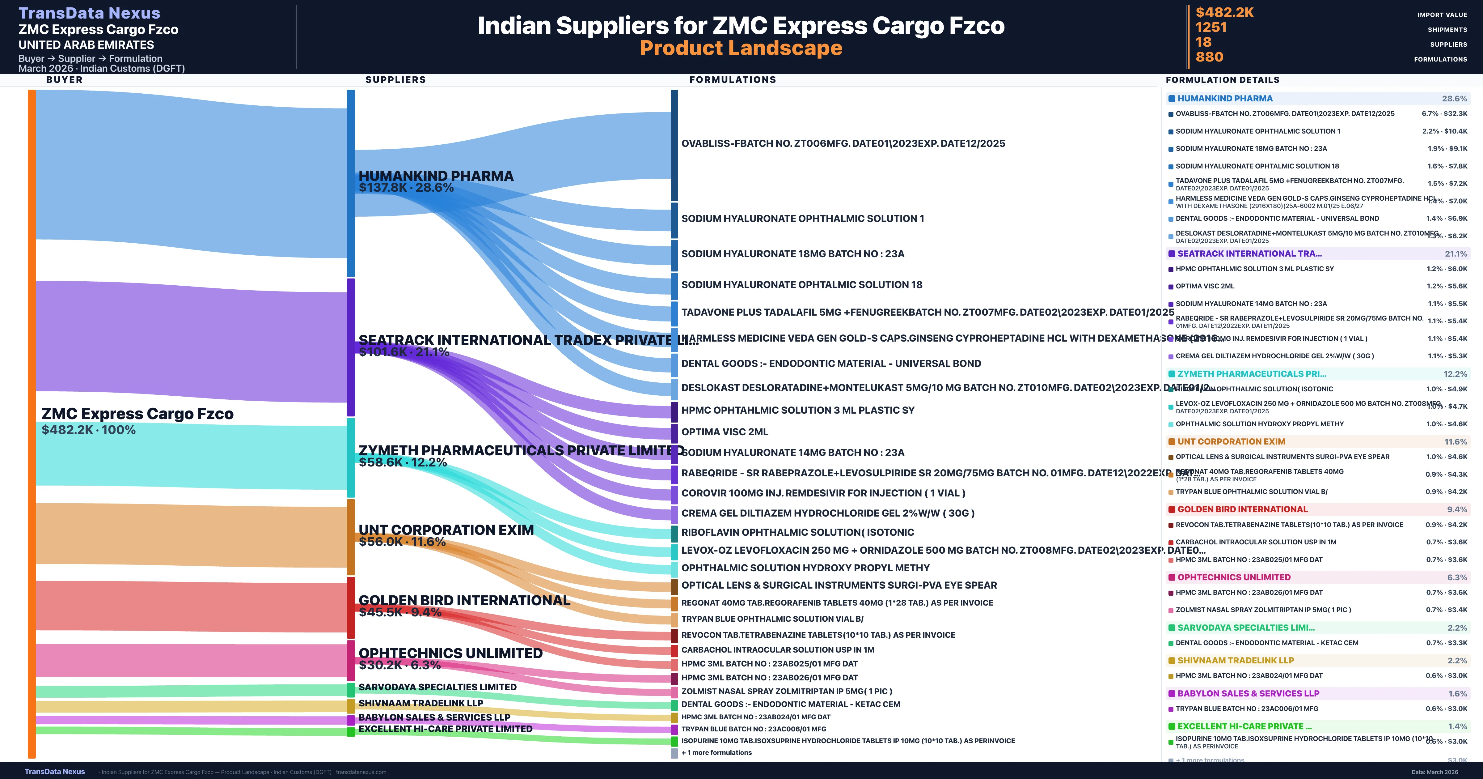 ZMC Express Cargo Fzco is a pharmaceutical importer based in United Arab Emirates with a total trade value of $8.7K across 3 products in 2 therapeutic categories. Based on 15 verified import shipments from Indian Customs (DGFT) records, the company actively imports across multiple product segments. ZMC Express Cargo Fzco sources from 18 verified Indian suppliers, with Humankind Pharma accounting for 28.6% of imports.