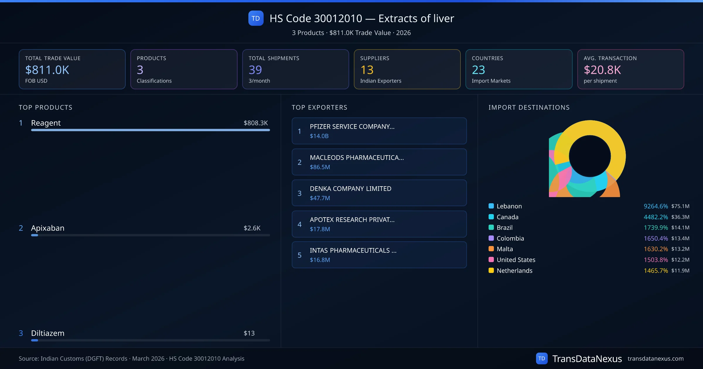 The top importing markets include Lebanon, Canada, Brazil. The top 5 products account for 100.0% of total trade under this code. Average transaction value is $20.8K. Leading exporters include PFIZER SERVICE COMPANY BV and MACLEODS PHARMACEUTICALS LTD. Data sourced from Indian Customs (DGFT) shipping bill records.