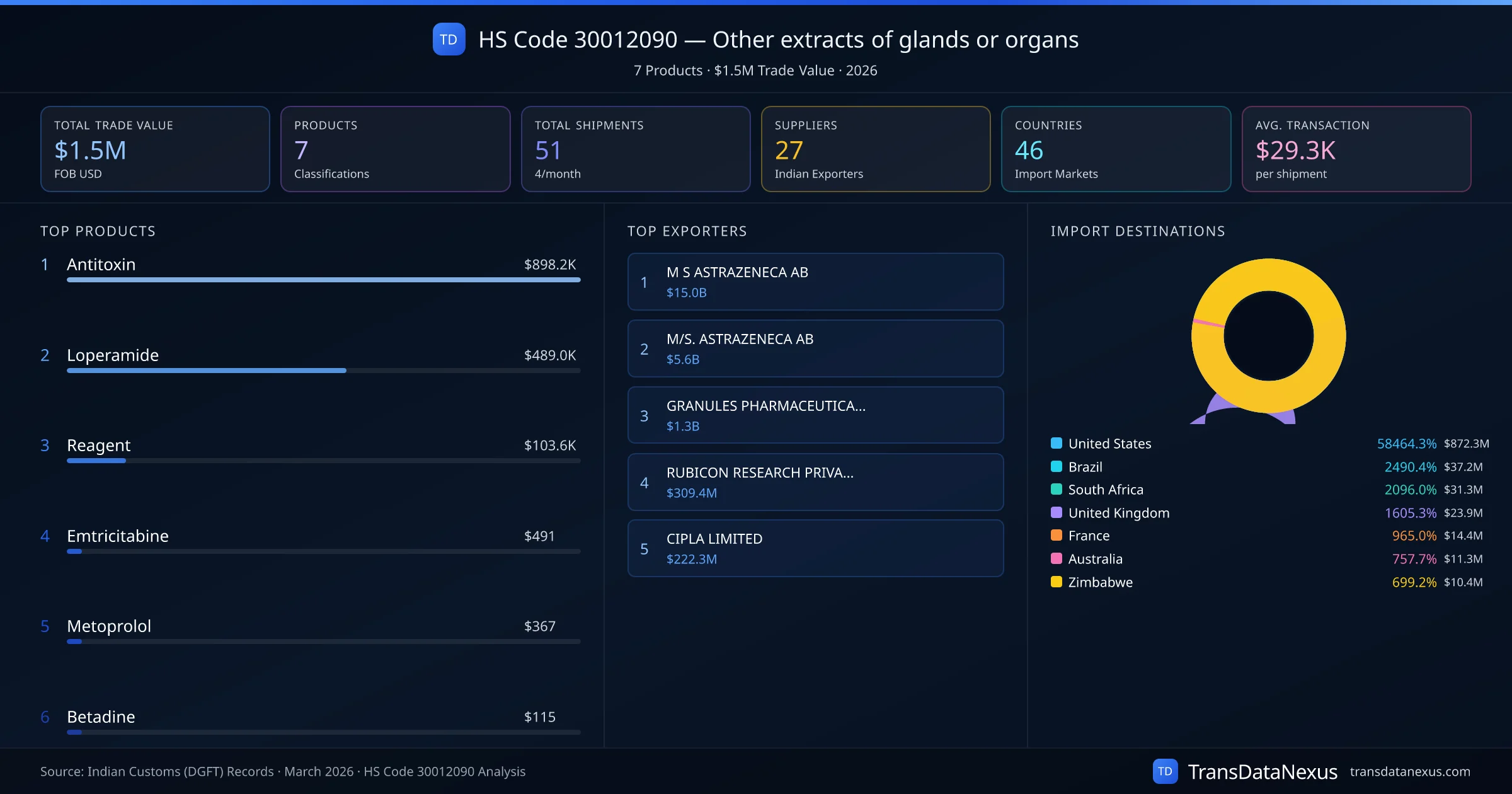 HS Code 30012090 (Other extracts of glands or organs) is one of India's most significant pharmaceutical export classifications under Chapter 30 of the Harmonized System. With a total trade value of $1.5M across 51 shipments, this code covers 7 distinct pharmaceutical products exported by 27 Indian manufacturers to 46 countries. The leading product under this classification is Antitoxin at $898.2K, followed by Loperamide and Reagent.