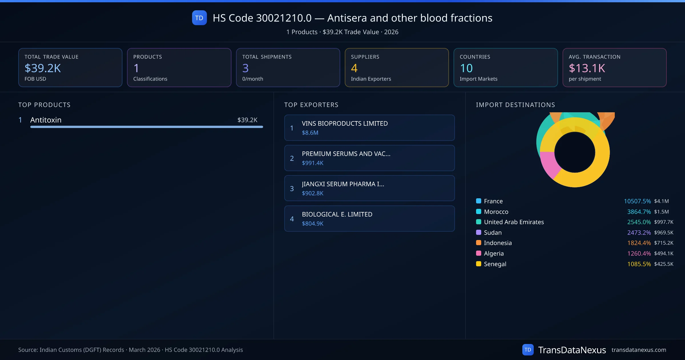 HS Code 30021210.0 (Antisera and other blood fractions) is one of India's most significant pharmaceutical export classifications under Chapter 30 of the Harmonized System. With a total trade value of $39.2K across 3 shipments, this code covers 1 distinct pharmaceutical products exported by 4 Indian manufacturers to 10 countries. The leading product under this classification is Antitoxin at $39.2K, followed by .