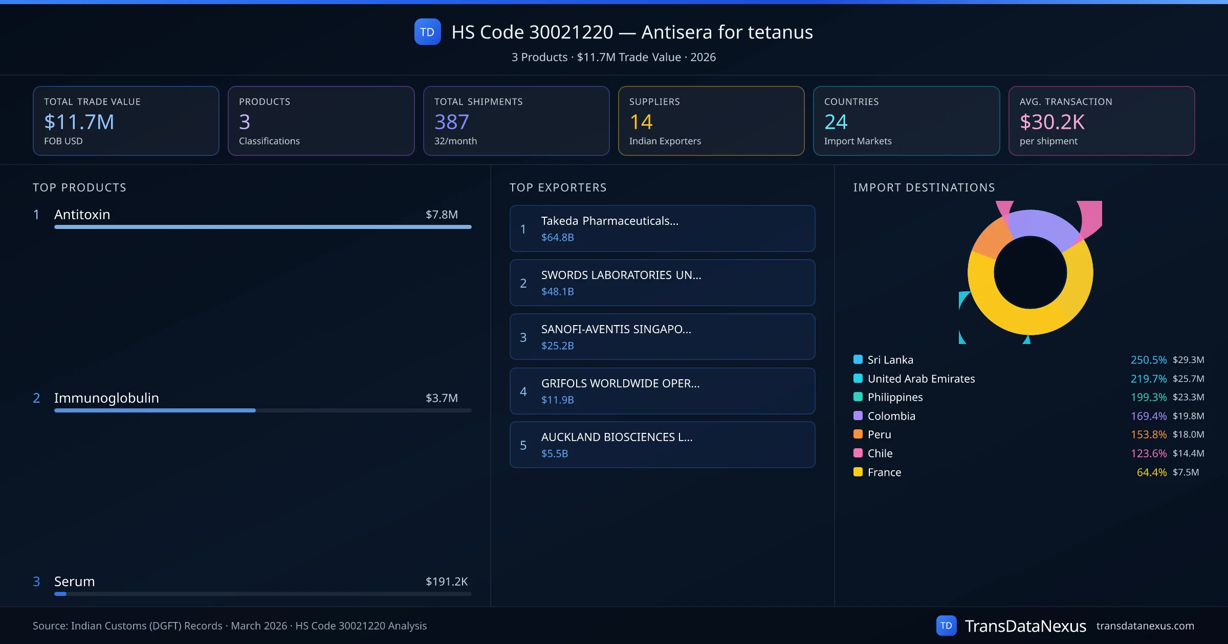 HS Code 30021220 (Antisera for tetanus) is one of India's most significant pharmaceutical export classifications under Chapter 30 of the Harmonized System. With a total trade value of $11.7M across 387 shipments, this code covers 3 distinct pharmaceutical products exported by 14 Indian manufacturers to 24 countries. The leading product under this classification is Antitoxin at $7.8M, followed by Immunoglobulin and Serum.