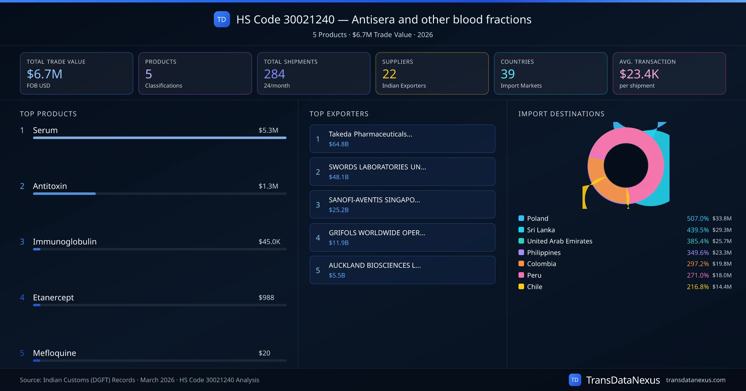 HS code 30021240 refers to "Antisera and other blood fractions" under Chapter 30 (Pharmaceutical Products), Heading 3002 (Blood, antisera, vaccines, toxins, microorganisms and similar products) of the Harmonized System. In India's export trade, this code covers $6.7M in trade value across 284 shipments from 22 exporters to 39 countries.
