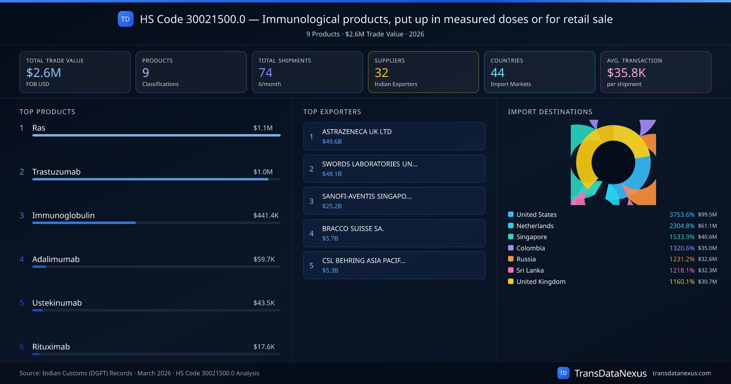 HS Code 30021500.0 (Immunological products, put up in measured doses or for retail sale) is one of India's most significant pharmaceutical export classifications under Chapter 30 of the Harmonized System. With a total trade value of $2.6M across 74 shipments, this code covers 9 distinct pharmaceutical products exported by 32 Indian manufacturers to 44 countries. The leading product under this classification is Ras at $1.1M, followed by Trastuzumab and Immunoglobulin.