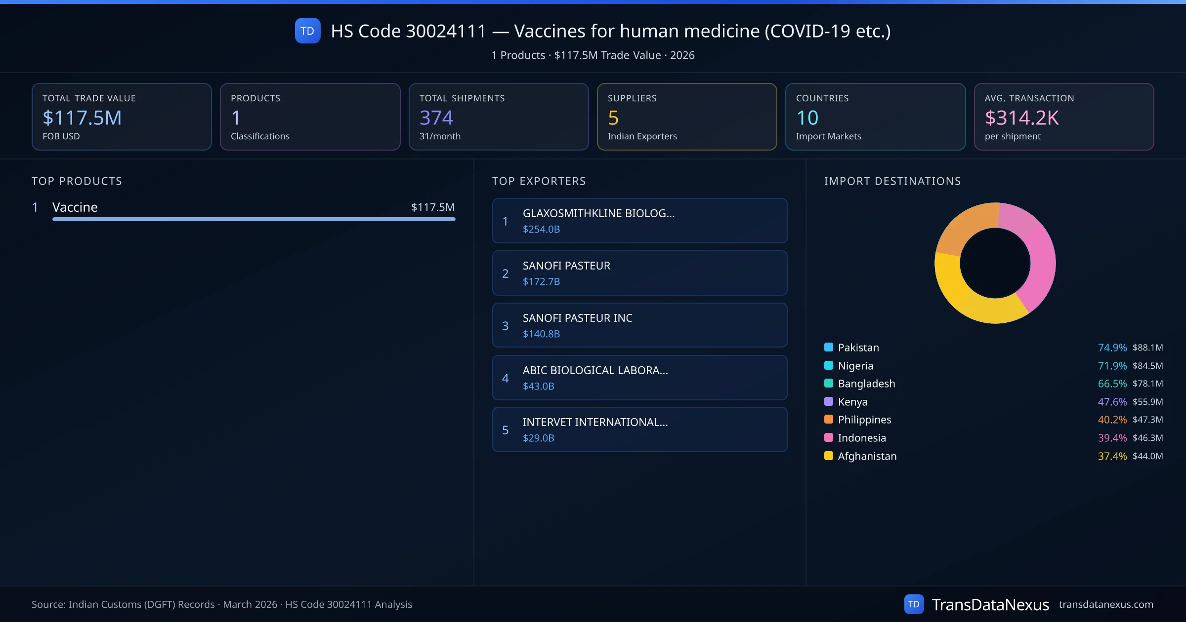 The top importing markets include Pakistan, Nigeria, Bangladesh. The top 5 products account for 100.0% of total trade under this code. Average transaction value is $314.2K. Leading exporters include GLAXOSMITHKLINE BIOLOGICALS SA and SANOFI PASTEUR. Data sourced from Indian Customs (DGFT) shipping bill records.