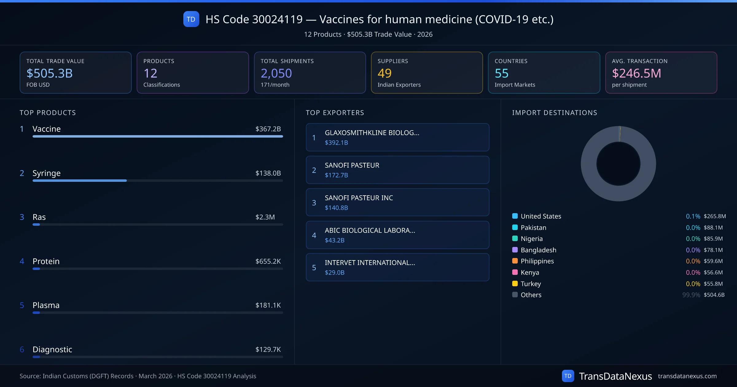 HS code 30024119 refers to "Vaccines for human medicine (COVID-19 etc.)" under Chapter 30 (Pharmaceutical Products), Heading 3002 (Blood, antisera, vaccines, toxins, microorganisms and similar products) of the Harmonized System. In India's export trade, this code covers $505.3B in trade value across 2,050 shipments from 49 exporters to 55 countries.