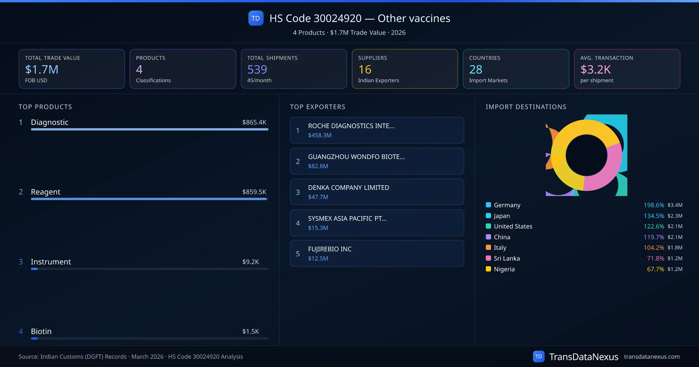 HS Code 30024920 (Other vaccines) is one of India's most significant pharmaceutical export classifications under Chapter 30 of the Harmonized System. With a total trade value of $1.7M across 539 shipments, this code covers 4 distinct pharmaceutical products exported by 16 Indian manufacturers to 28 countries. The leading product under this classification is Diagnostic at $865.4K, followed by Reagent and Instrument.