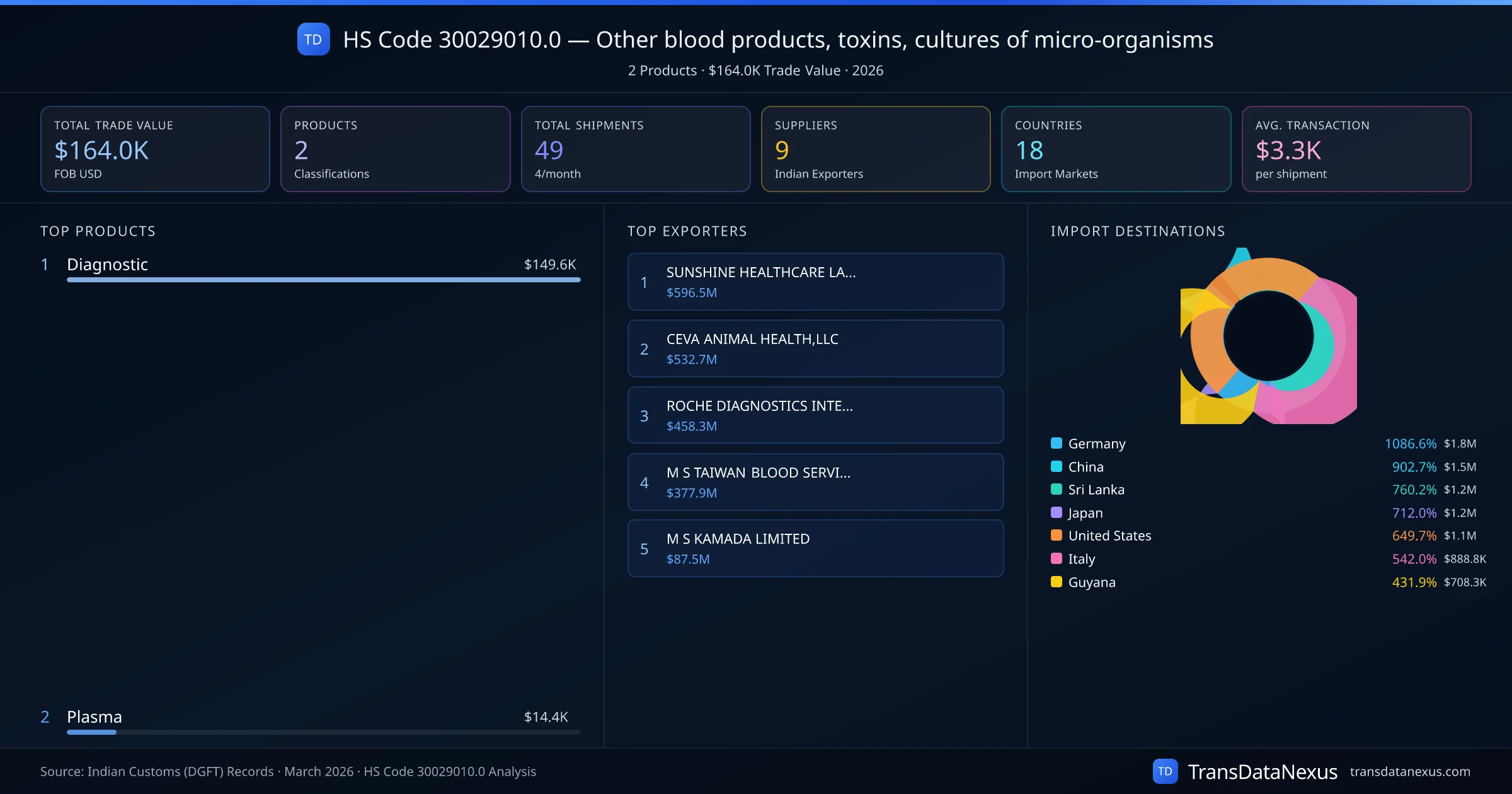 The top importing markets include Germany, China, Sri Lanka. The top 5 products account for 100.0% of total trade under this code. Average transaction value is $3.3K. Leading exporters include SUNSHINE HEALTHCARE LANKA LTD and CEVA ANIMAL HEALTH,LLC. Data sourced from Indian Customs (DGFT) shipping bill records.