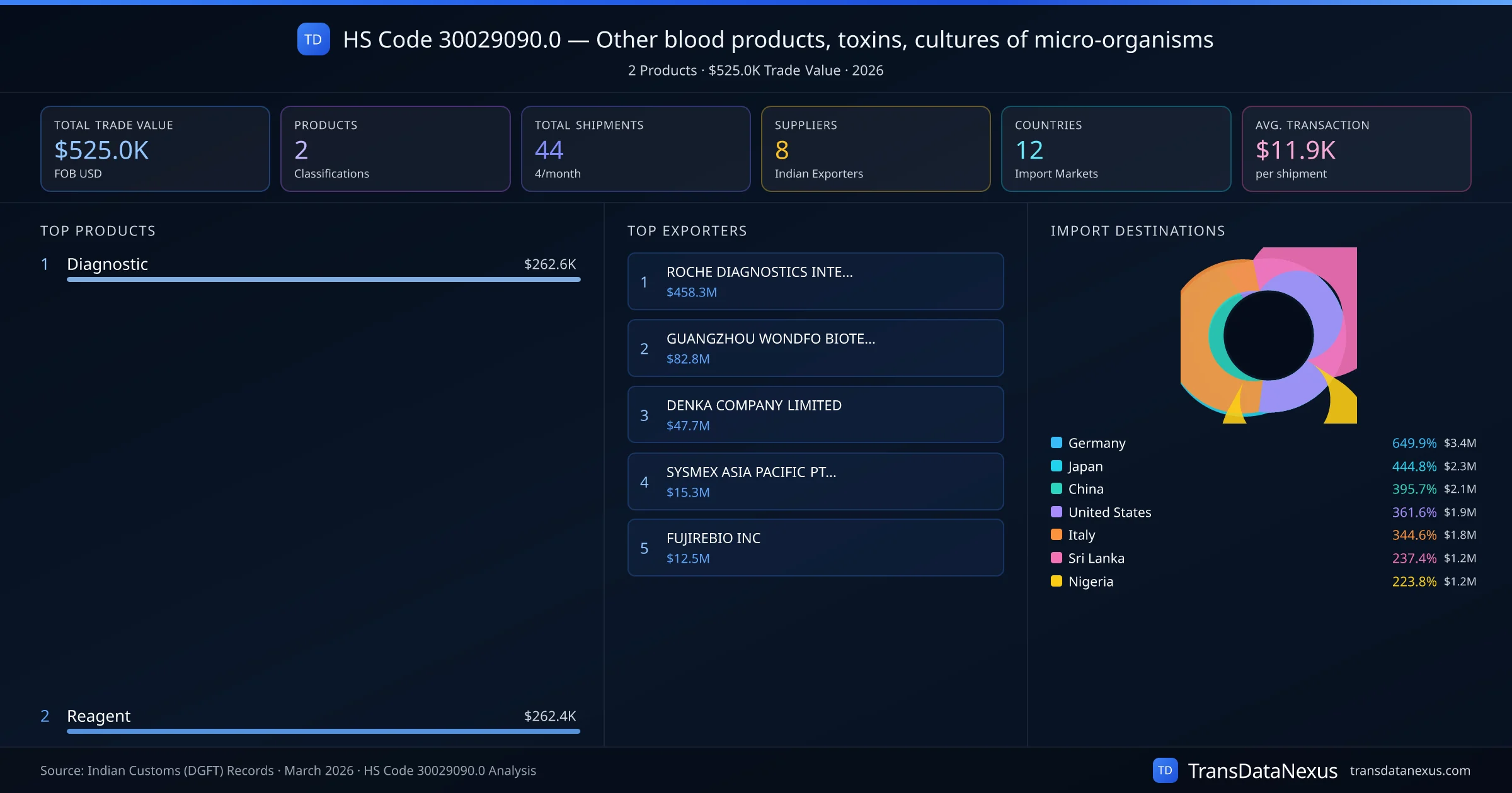 The top importing markets include Germany, Japan, China. The top 5 products account for 100.0% of total trade under this code. Average transaction value is $11.9K. Leading exporters include ROCHE DIAGNOSTICS INTERNATIONAL LTD and GUANGZHOU WONDFO BIOTECH CO LIMITED. Data sourced from Indian Customs (DGFT) shipping bill records.