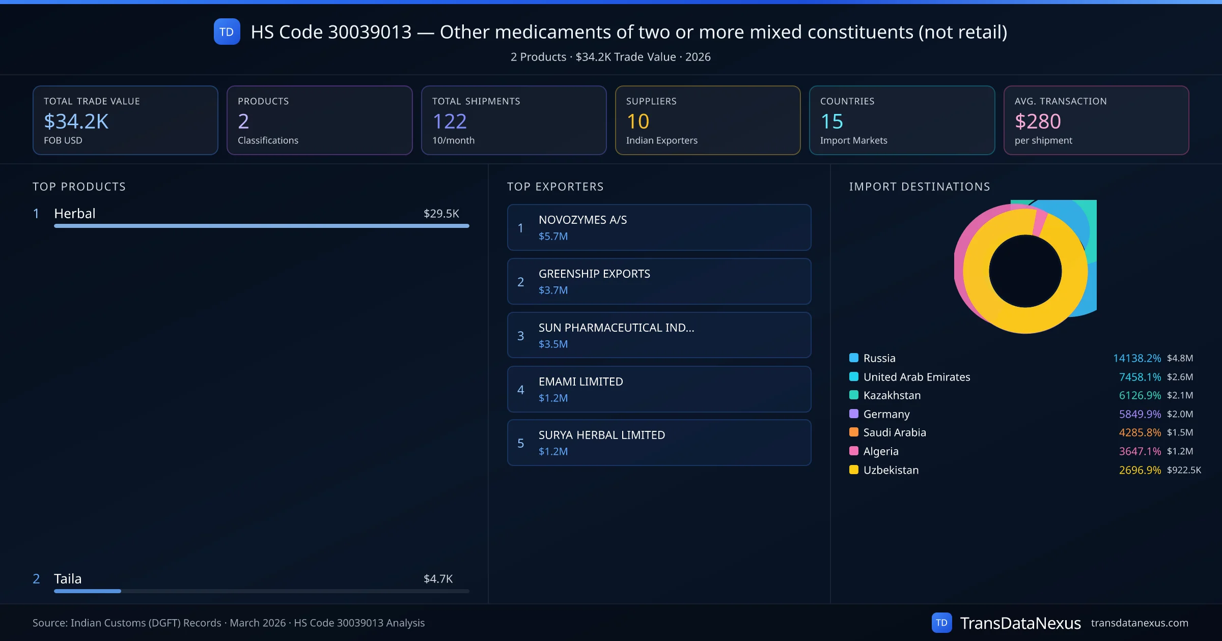 HS Code 30039013 (Other medicaments of two or more mixed constituents (not retail)) is one of India's most significant pharmaceutical export classifications under Chapter 30 of the Harmonized System. With a total trade value of $34.2K across 122 shipments, this code covers 2 distinct pharmaceutical products exported by 10 Indian manufacturers to 15 countries. The leading product under this classification is Herbal at $29.5K, followed by Taila.