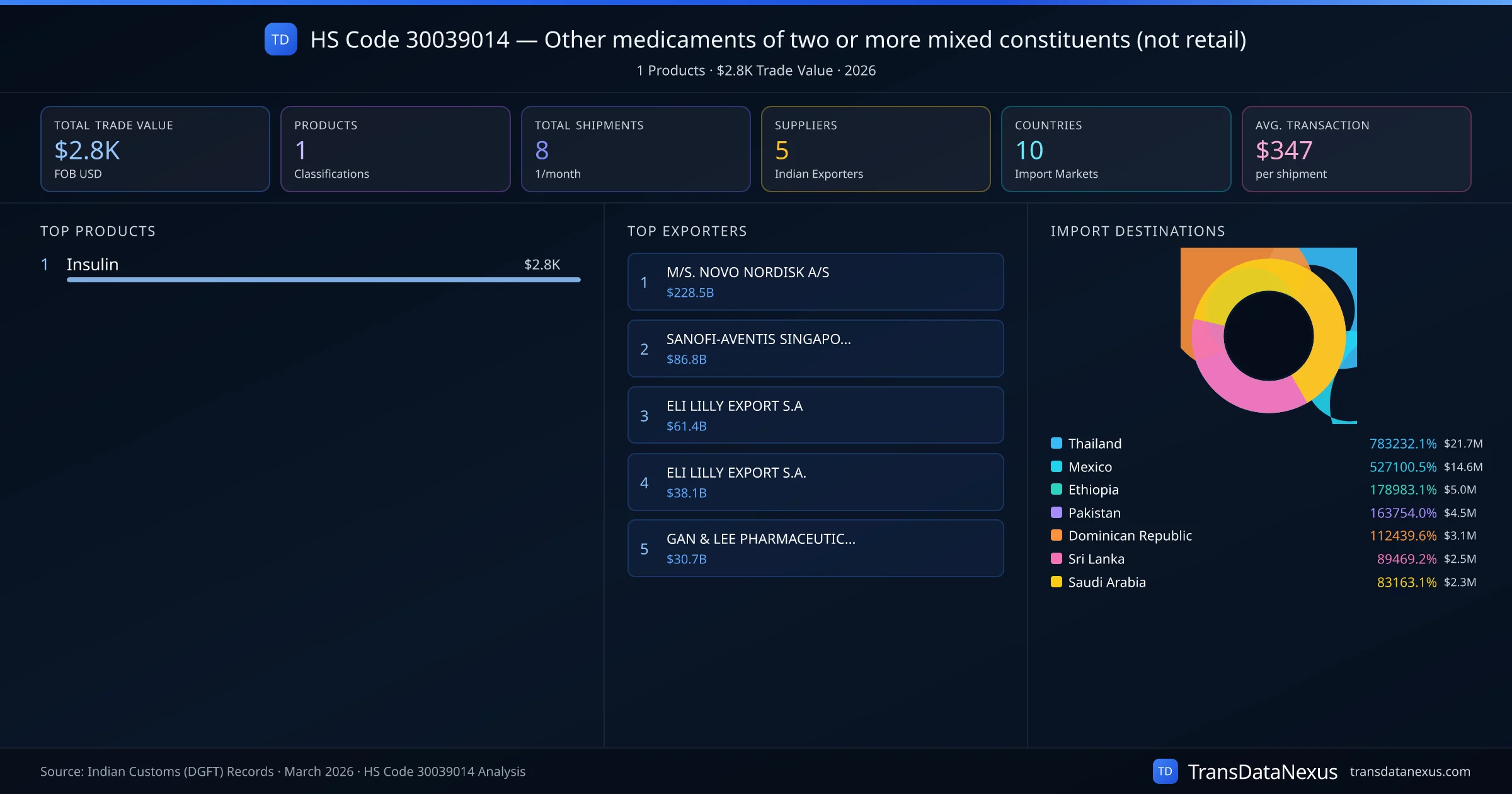 The top importing markets include Thailand, Mexico, Ethiopia. The top 5 products account for 100.0% of total trade under this code. Average transaction value is $347. Leading exporters include M/S. NOVO NORDISK A/S and SANOFI-AVENTIS SINGAPORE PTE LTD. Data sourced from Indian Customs (DGFT) shipping bill records.