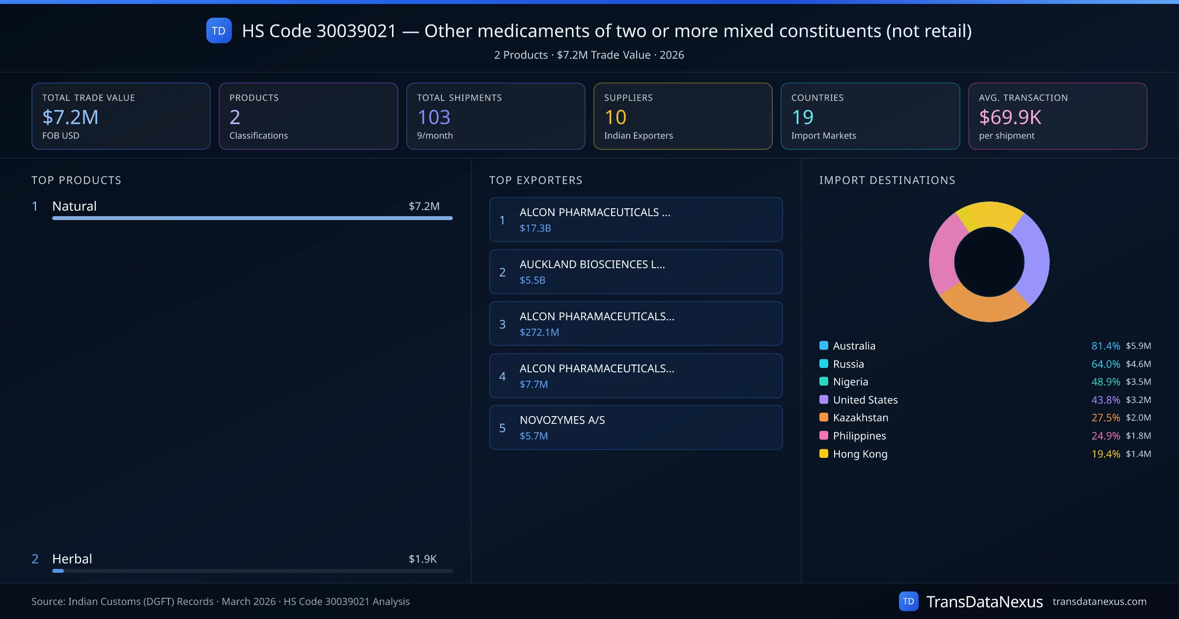 HS Code 30039021 (Other medicaments of two or more mixed constituents (not retail)) is one of India's most significant pharmaceutical export classifications under Chapter 30 of the Harmonized System. With a total trade value of $7.2M across 103 shipments, this code covers 2 distinct pharmaceutical products exported by 10 Indian manufacturers to 19 countries. The leading product under this classification is Natural at $7.2M, followed by Herbal.
