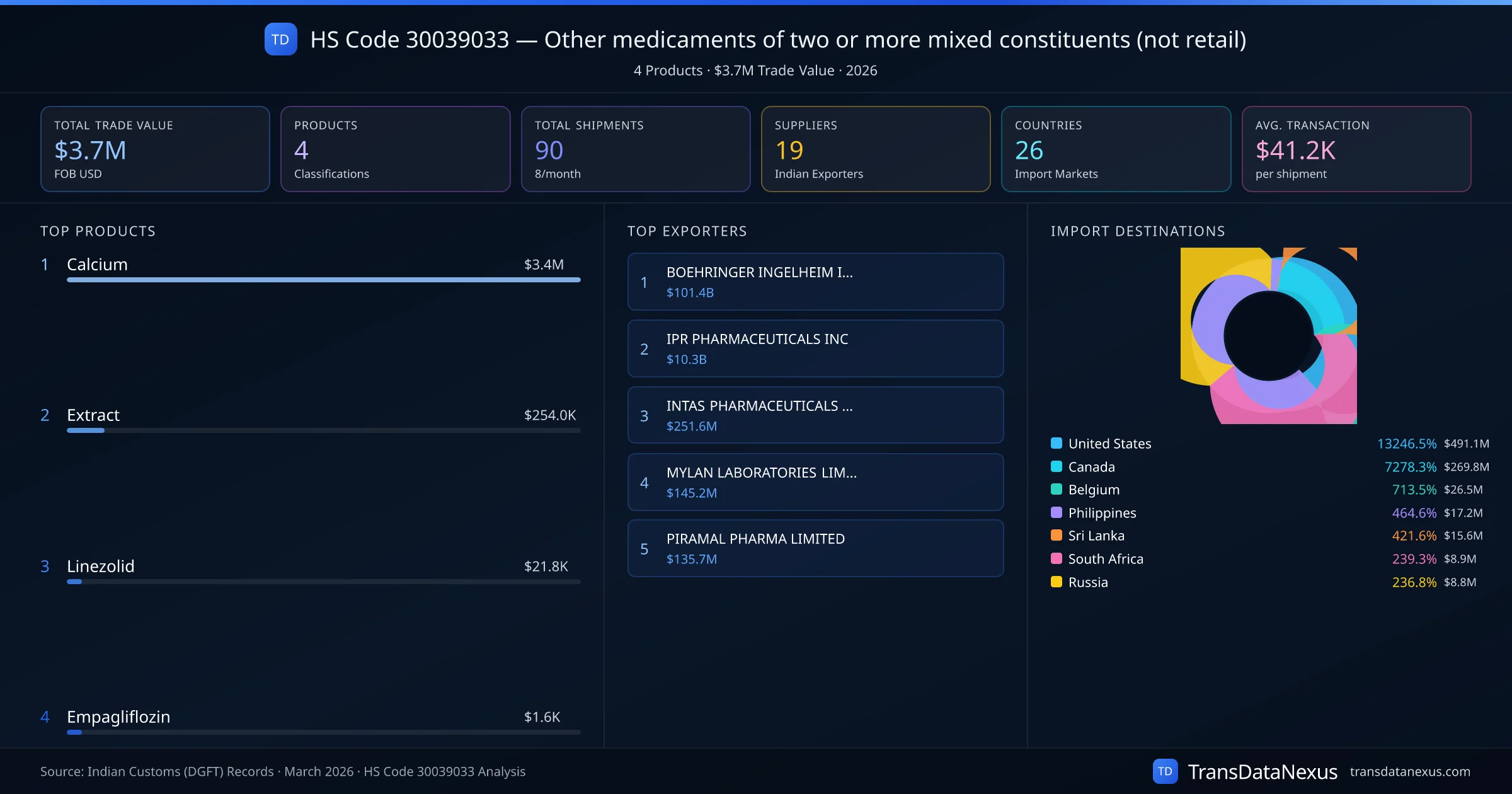 HS Code 30039033 (Other medicaments of two or more mixed constituents (not retail)) is one of India's most significant pharmaceutical export classifications under Chapter 30 of the Harmonized System. With a total trade value of $3.7M across 90 shipments, this code covers 4 distinct pharmaceutical products exported by 19 Indian manufacturers to 26 countries. The leading product under this classification is Calcium at $3.4M, followed by Extract and Linezolid.