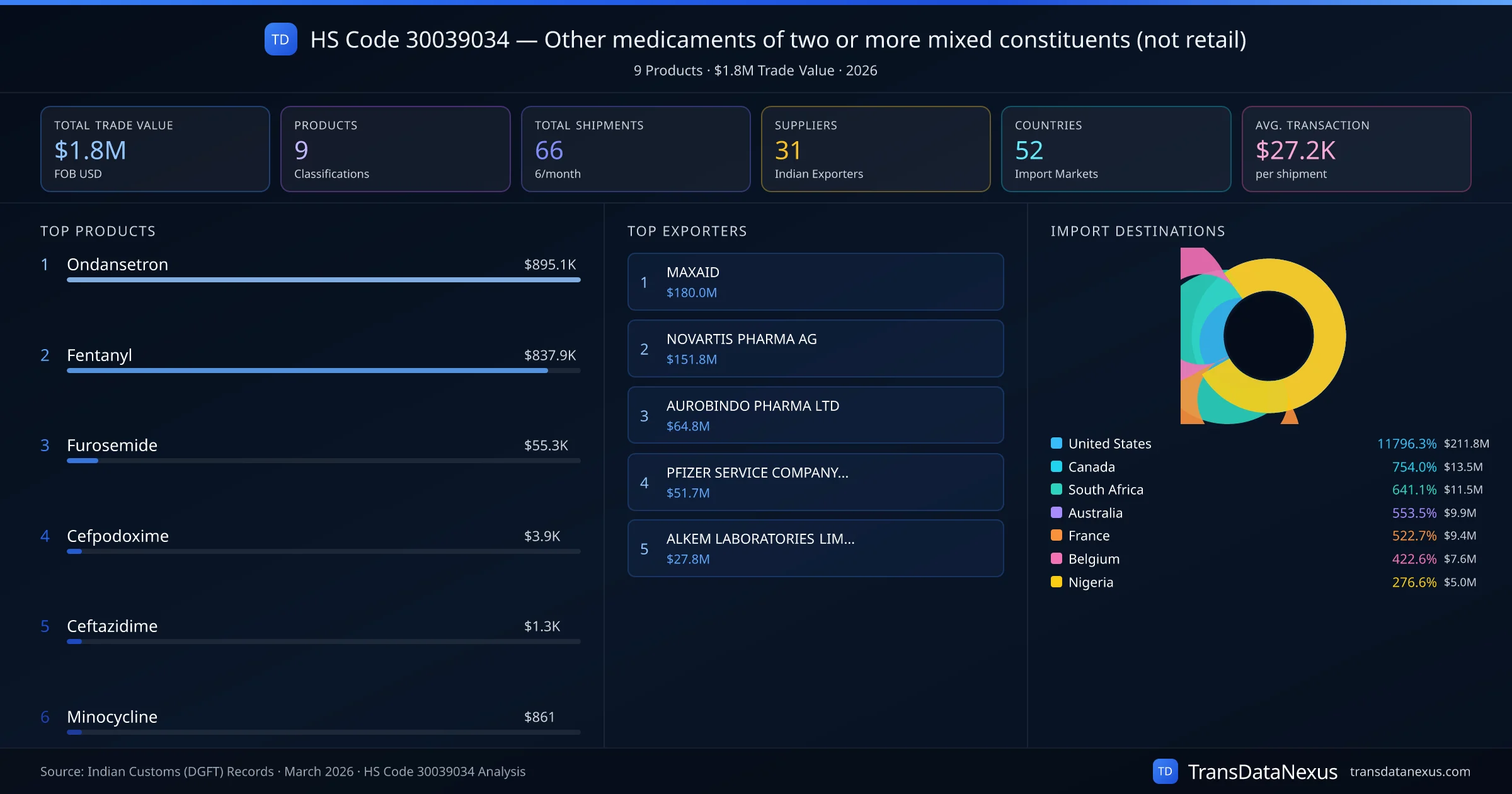 HS Code 30039034 (Other medicaments of two or more mixed constituents (not retail)) is one of India's most significant pharmaceutical export classifications under Chapter 30 of the Harmonized System. With a total trade value of $1.8M across 66 shipments, this code covers 9 distinct pharmaceutical products exported by 31 Indian manufacturers to 52 countries. The leading product under this classification is Ondansetron at $895.1K, followed by Fentanyl and Furosemide.