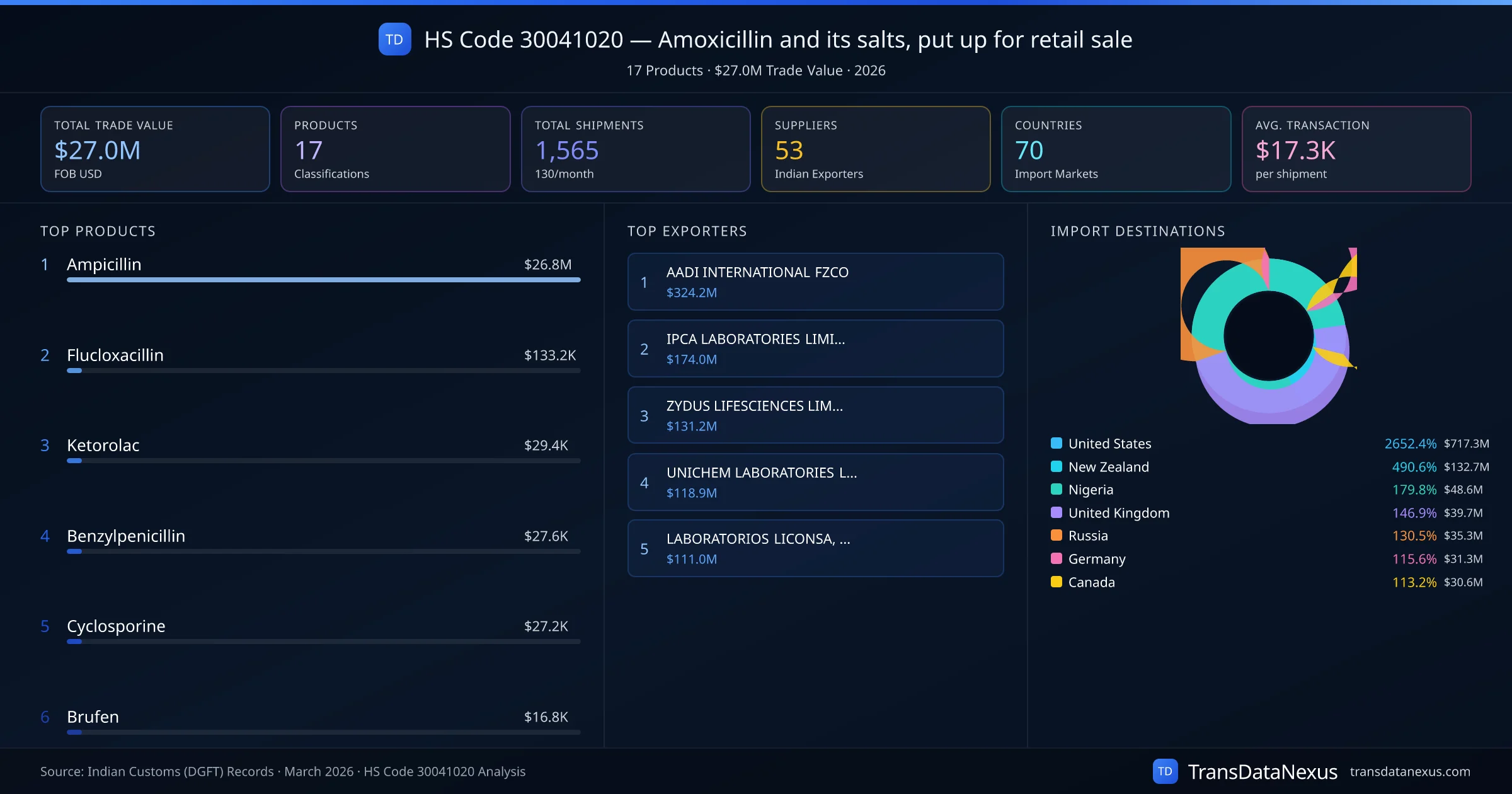 HS Code 30041020 (Amoxicillin and its salts, put up for retail sale) is one of India's most significant pharmaceutical export classifications under Chapter 30 of the Harmonized System. With a total trade value of $27.0M across 1,565 shipments, this code covers 17 distinct pharmaceutical products exported by 53 Indian manufacturers to 70 countries. The leading product under this classification is Ampicillin at $26.8M, followed by Flucloxacillin and Ketorolac.