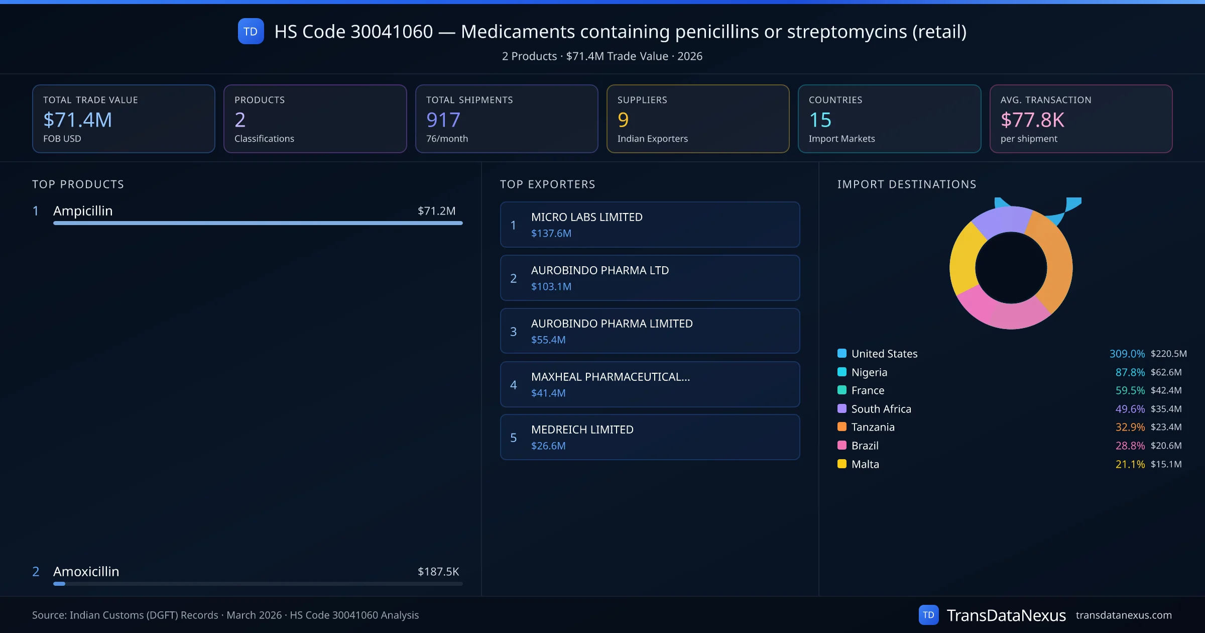 The top importing markets include United States, Nigeria, France. The top 5 products account for 100.0% of total trade under this code. Average transaction value is $77.8K. Leading exporters include MICRO LABS LIMITED and AUROBINDO PHARMA LTD. Data sourced from Indian Customs (DGFT) shipping bill records.