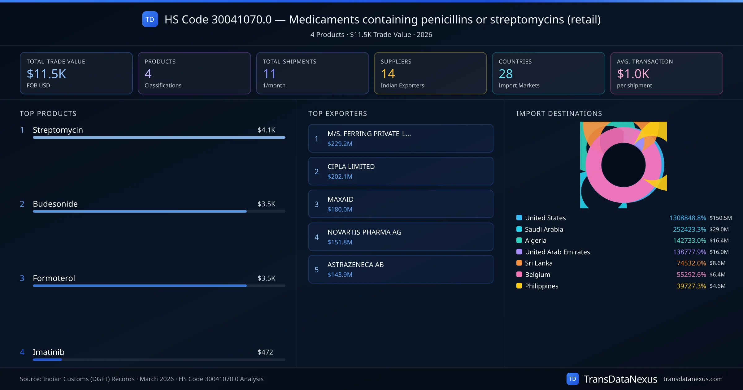 HS Code 30041070.0 (Medicaments containing penicillins or streptomycins (retail)) is one of India's most significant pharmaceutical export classifications under Chapter 30 of the Harmonized System. With a total trade value of $11.5K across 11 shipments, this code covers 4 distinct pharmaceutical products exported by 14 Indian manufacturers to 28 countries. The leading product under this classification is Streptomycin at $4.1K, followed by Budesonide and Formoterol.