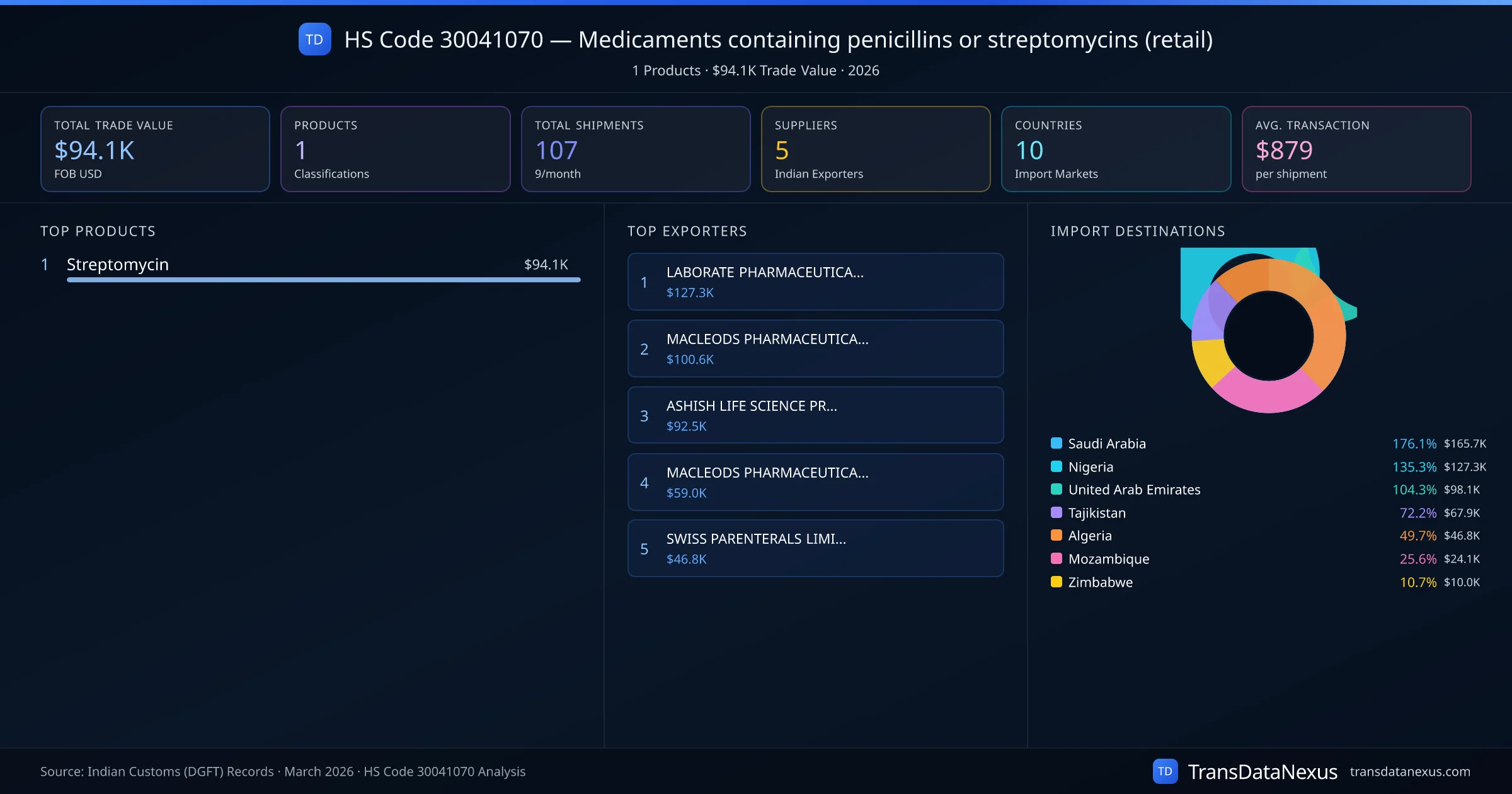 The top importing markets include Saudi Arabia, Nigeria, United Arab Emirates. The top 5 products account for 100.0% of total trade under this code. Average transaction value is $879. Leading exporters include LABORATE PHARMACEUTICALS INDIA LTD and MACLEODS PHARMACEUTICALS LIMITED. Data sourced from Indian Customs (DGFT) shipping bill records.