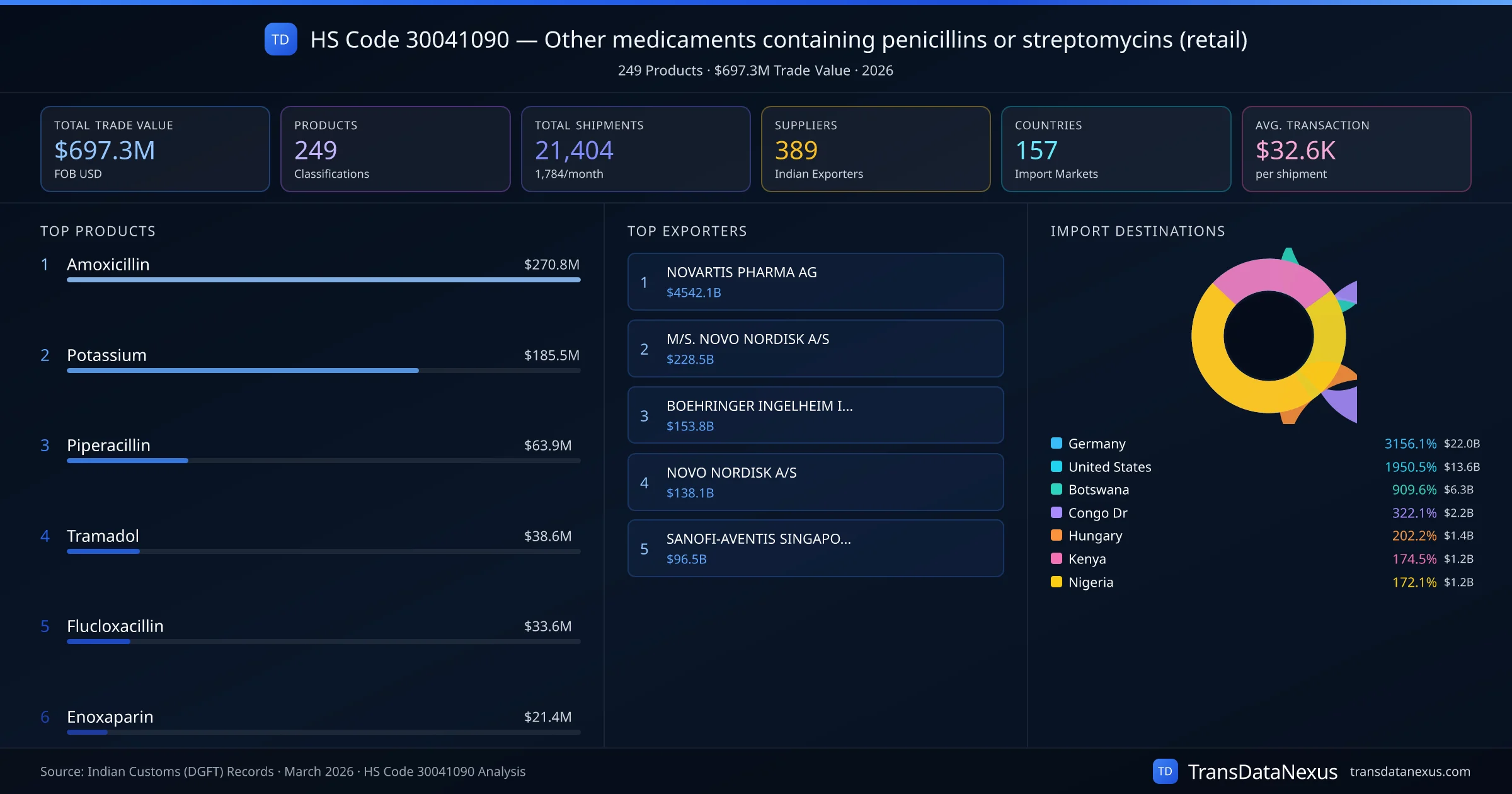 HS Code 30041090 (Other medicaments containing penicillins or streptomycins (retail)) is one of India's most significant pharmaceutical export classifications under Chapter 30 of the Harmonized System. With a total trade value of $697.3M across 21,404 shipments, this code covers 249 distinct pharmaceutical products exported by 389 Indian manufacturers to 157 countries. The leading product under this classification is Amoxicillin at $270.8M, followed by Potassium and Piperacillin.